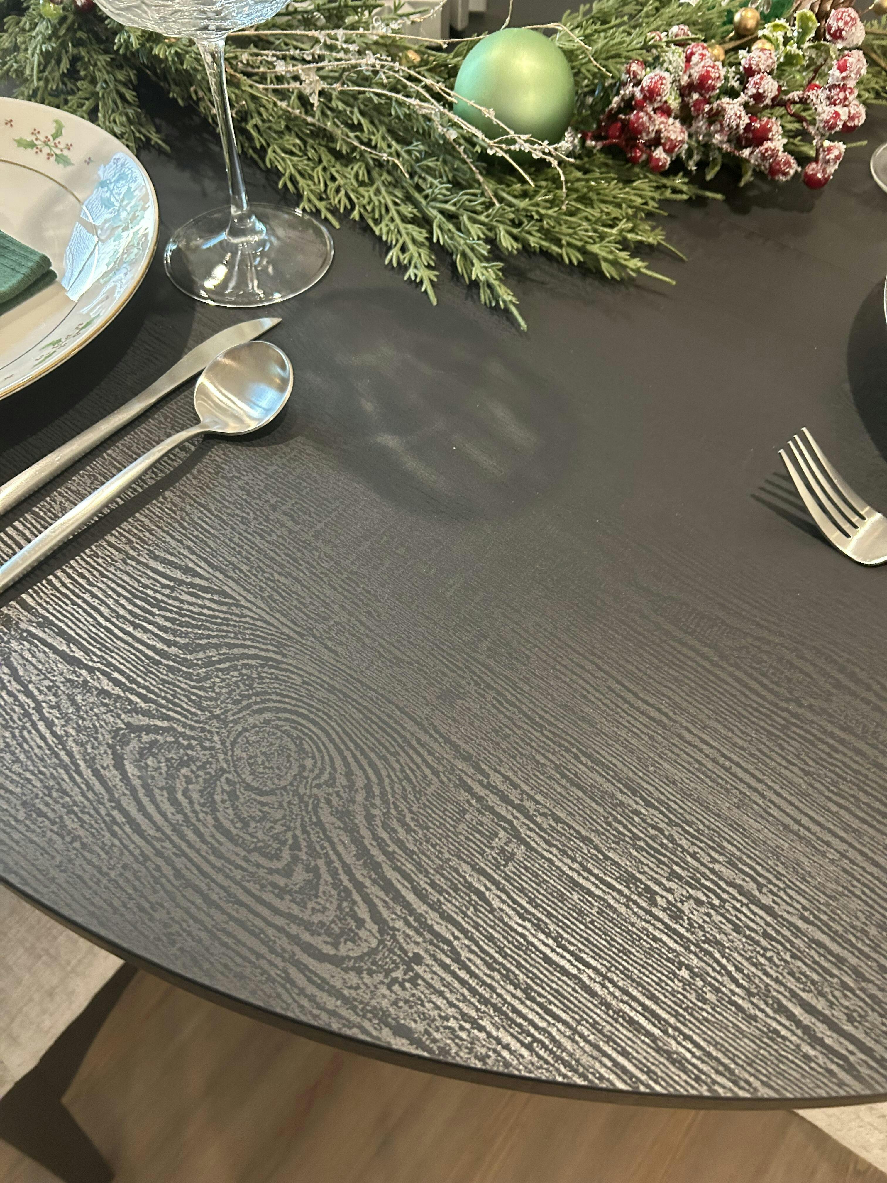 I ordered black matte pleather placemats that complement the matte finish on the table. The table top is heavy, has faux wood grain finish. It is impossible to tip the table by leaning on it. The base appears to be a heavy fiberglass covered in paperboard (how else do you cover a cylindrical shape?).