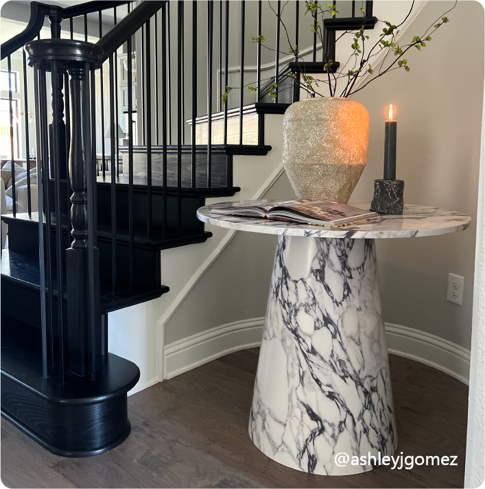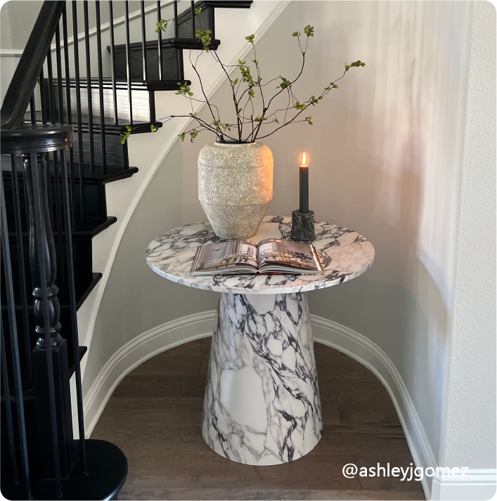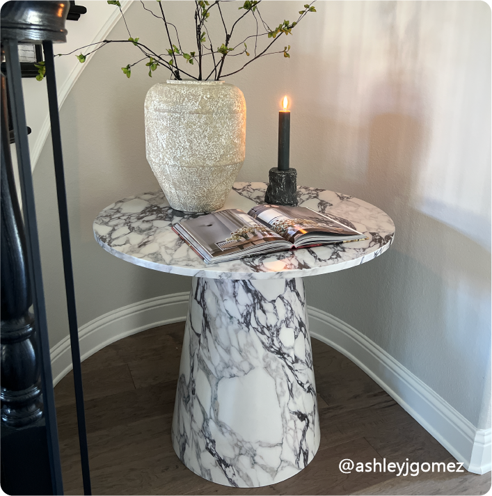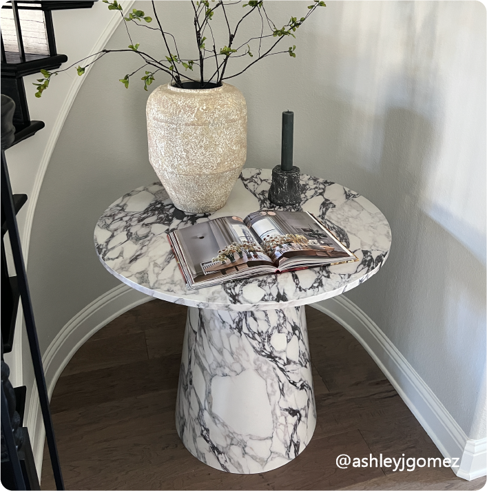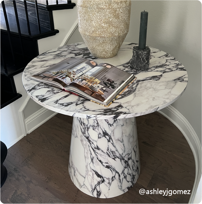 35" x 35'' is the perfect size for a small apartment that doesn't take up a lot of space. This is a natural style ideal for dining spaces. It is also a great entryway table or display table under your stairs. The pedestal base allows for maximum legroom and more comfort!Bvlgari Marble is known for its distinctive and luxurious appearance. The high-grade manufactured wood is filled with gorgeous Bvlgari marble look paper, make it a symbol of luxury and sophistication.