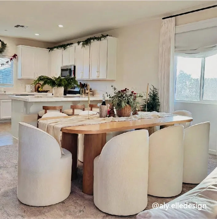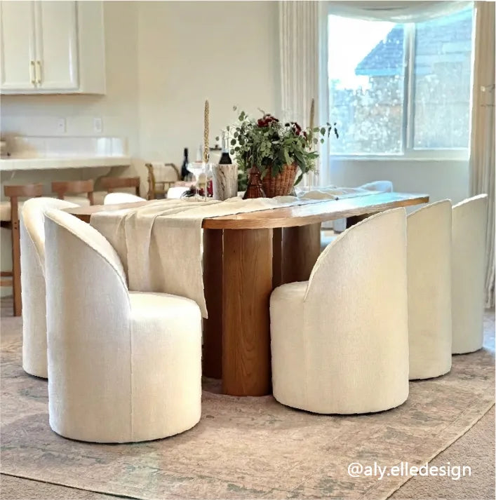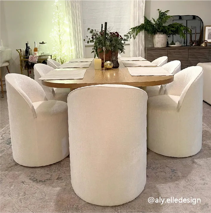 Built to impress and made for real life, this nine-piece set pairs a substantial 86.5" × 43.5" dining table with eight glide-anywhere barrel chairs. The table’s top and legs are veneered in authentic white oak for a natural, high-end look, while four round, weighty legs keep the surface rock-steady.