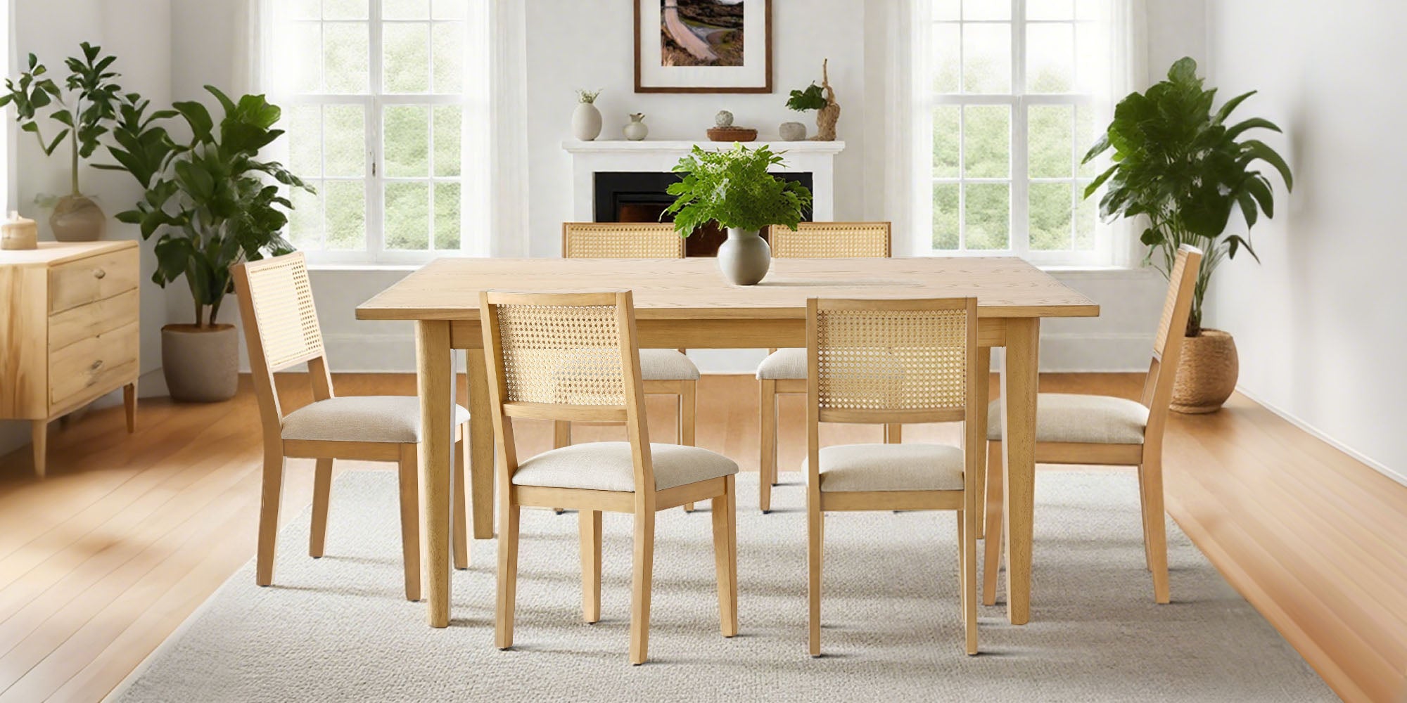 Create a warm, welcoming hub for everyday meals and special occasions with the Chan 7-Piece Dining Set. The sleek Chan Extendable Dining Table pairs with six Monica Faux Rattan Dining Chairs for a balanced mix of modern lines, natural texture, and cushioned comfort. Two leaves let the table expand from 63" to 95" for intimate dinners or larger celebrations, while the airy cane-look backs and padded seats keep everyone comfortable from first bite to last toast.