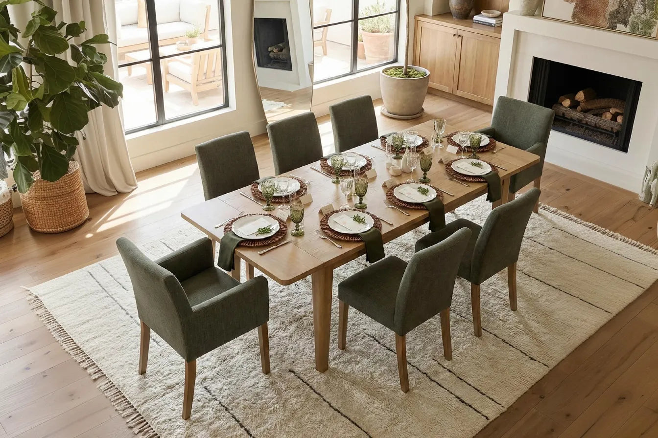 This refined dining set brings together timeless craftsmanship and everyday functionality. The table features a premium white oak veneer with beautifully natural grain, creating a warm, organic presence in any dining space. Its expandable design adjusts effortlessly from 63" to 79" and up to 95" with two extension leaves, comfortably seating 4 to 10 guests for both daily meals and special gatherings. Gently rounded safety corners and a solid, weighty construction add stability and family-friendly appeal, while clean lines and neutral tones ensure seamless pairing with a variety of interior styles. Paired with matching chairs upholstered in a soft linen-blend fabric, supported by warm rubberwood legs and an ergonomic high back, this set delivers lasting comfort with understated elegance.