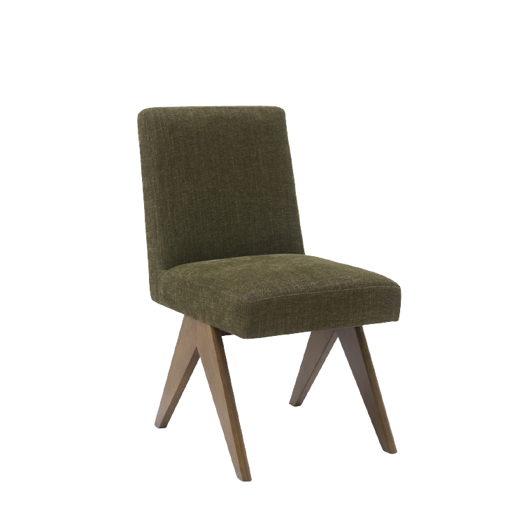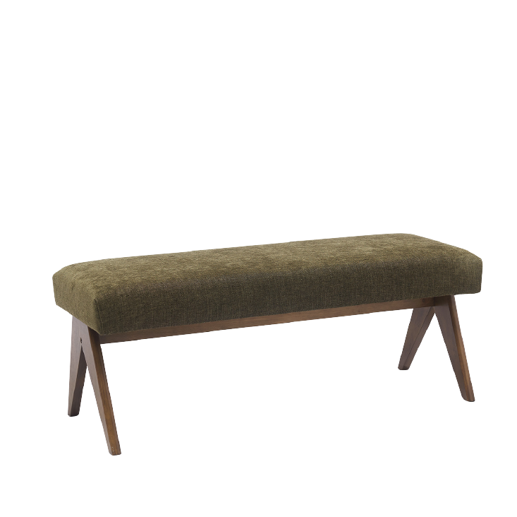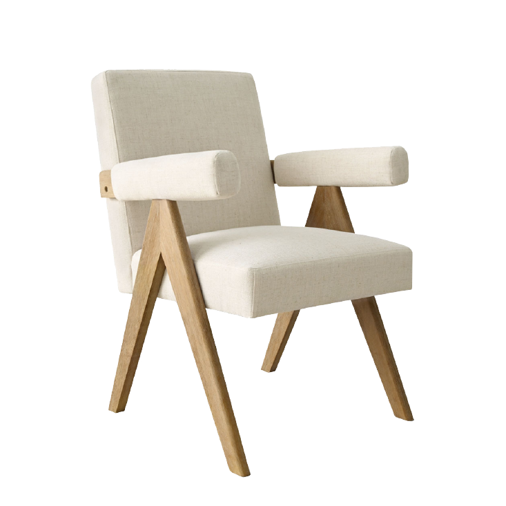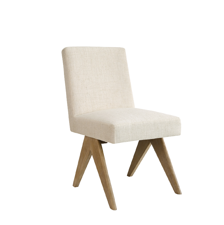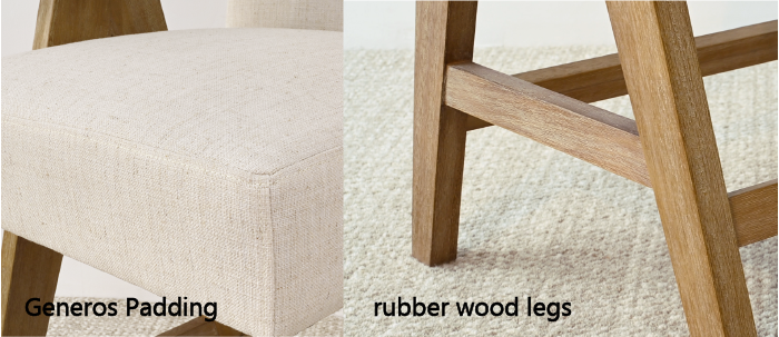 The whitewashed finish on the solid rubber wood legs adds a rustic patina that perfectly complements the fabric.