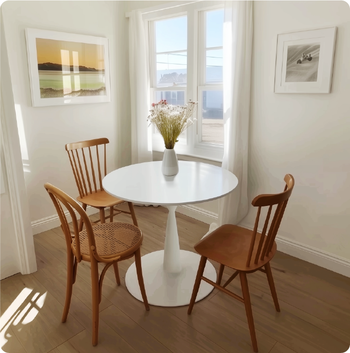 One of the standout features of the New Haven round white dining table is its versatility. Its compact size means it won’t overpower smaller spaces, and it’s easily movable if you need to rearrange your room or transport the table for an event. Plus, the table's neutral white color allows you to experiment with different color schemes and decorations, so you can change up your look without needing new furniture.