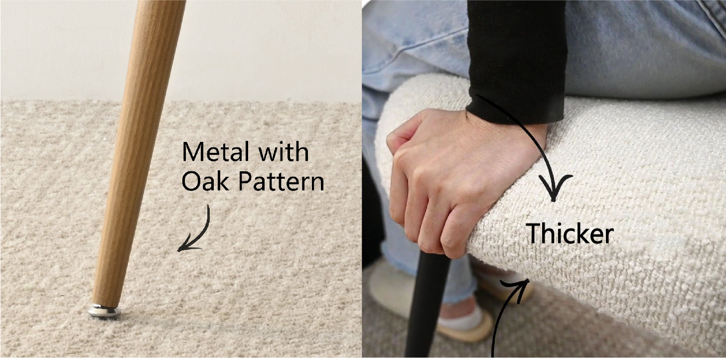 The contemporary bouclé fabric adds a modern, cozy touch that fits right in with any decor.The woven rattan? It's actually high-quality plastic that looks just like the real thing but won't get damp, moldy, or develop odors. The metal legs are incredibly sturdy, with a wood grain finish so realistic they could easily pass for wooden legs.