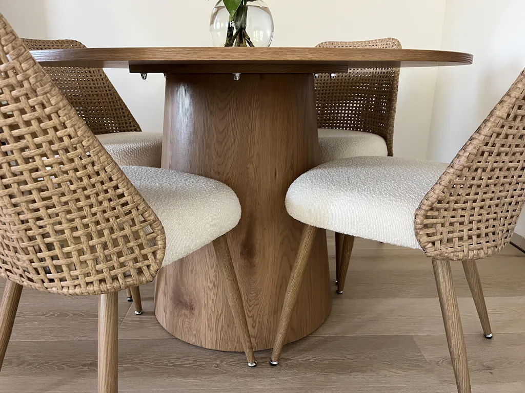 Transform your dining space into a bright, airy haven with this breezy coastal-inspired dining set. Woven-rattan design hugs a smooth, barrel-back silhouette, infusing relaxed coastal-boho vibes. A light-oak frame and ivory seat pad add organic-modern warmth—perfect for dining rooms that crave breezy beach-house charm and crisp, contemporary lines in a single piece. The chairs, crafted from premium plastic rattan, resist moisture, mold, and odors, ensuring lasting durability, while the high-density engineered wood table boasts an oak option with a sophisticated paper veneer finish.