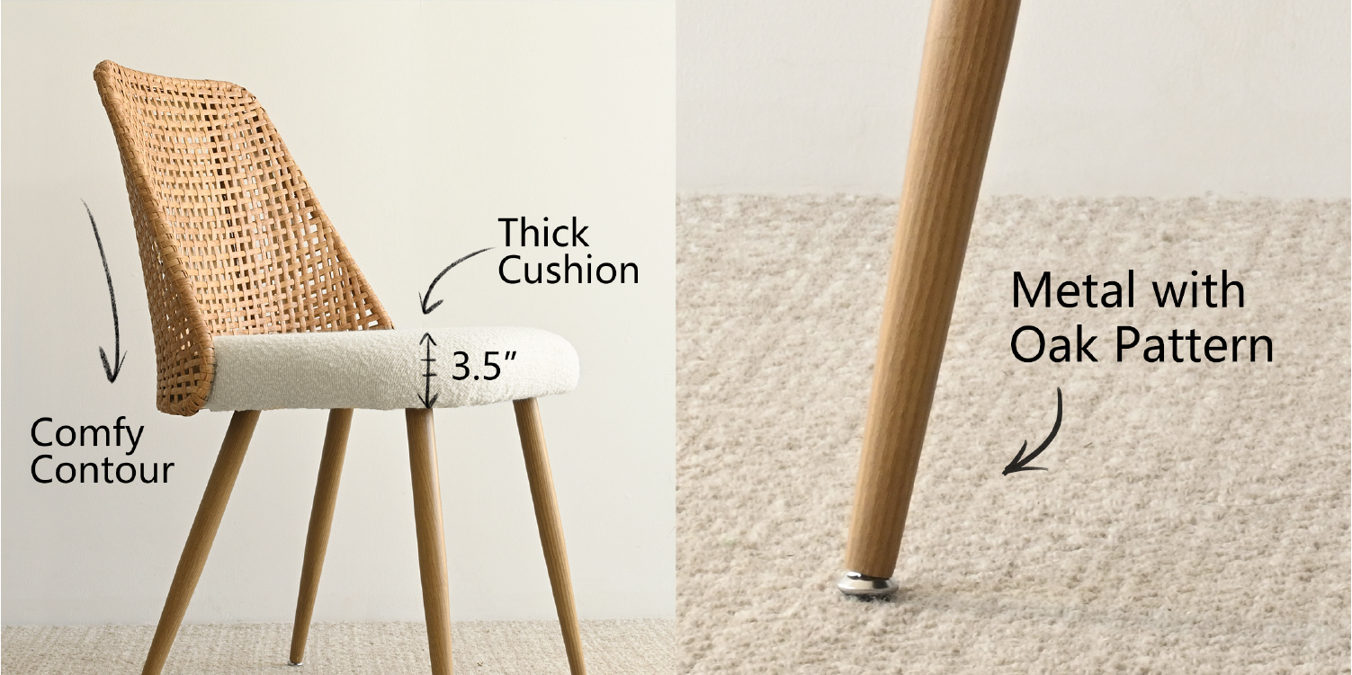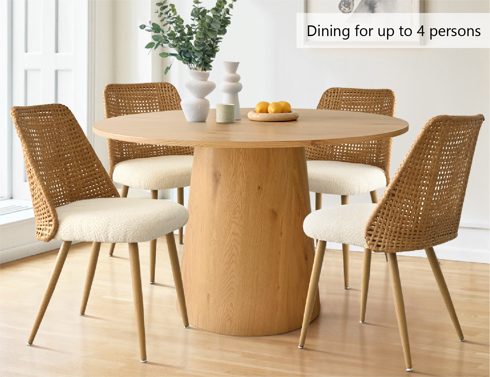 Transform your dining space into a bright, airy haven with this breezy coastal-inspired dining set. Woven-rattan design hugs a smooth, barrel-back silhouette, infusing relaxed coastal-boho vibes. A light-oak frame and ivory seat pad add organic-modern warmth—perfect for dining rooms that crave breezy beach-house charm and crisp, contemporary lines in a single piece. The chairs, crafted from premium plastic rattan, resist moisture, mold, and odors, ensuring lasting durability, while the high-density engineered wood table boasts an oak option with a sophisticated paper veneer finish.