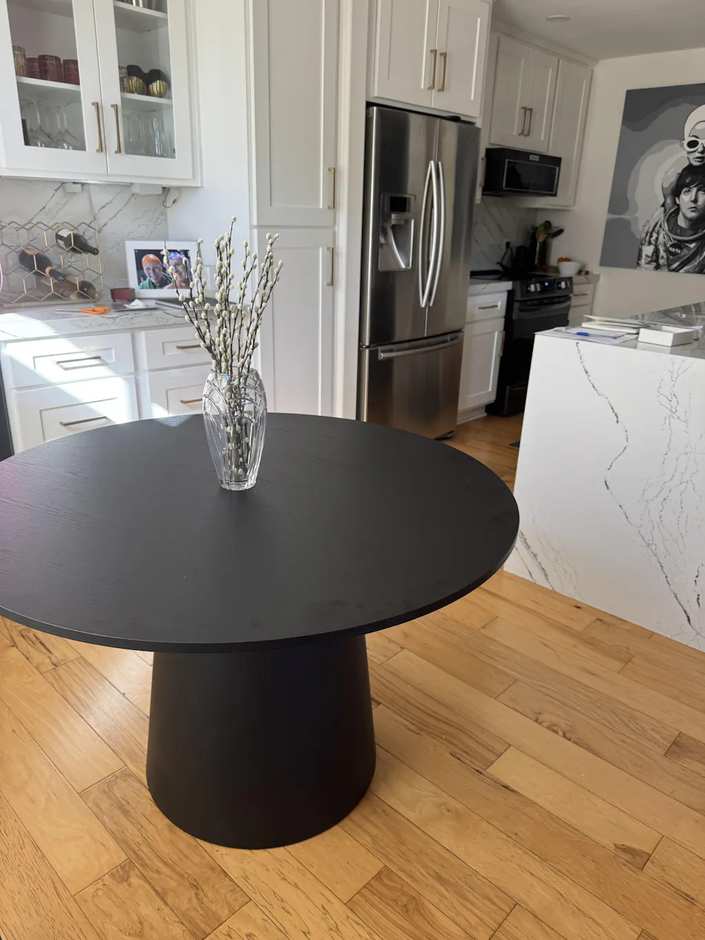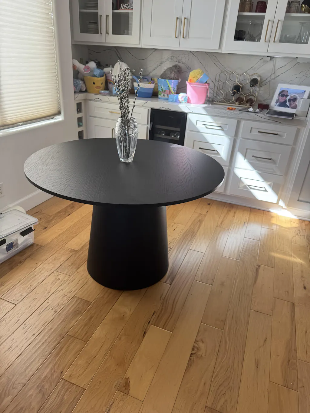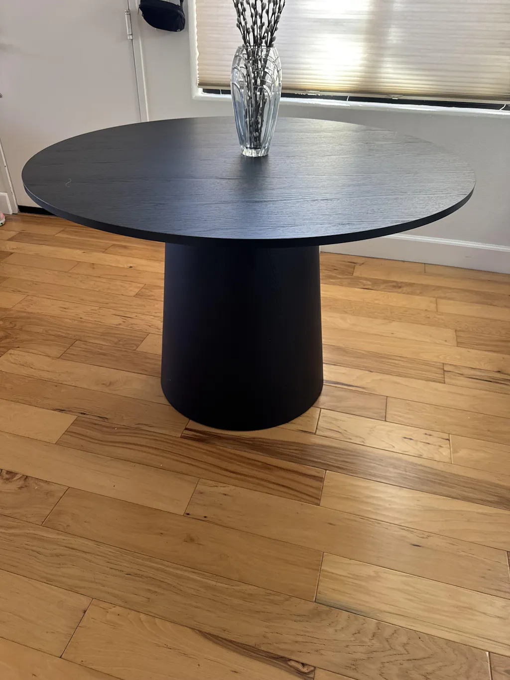 Obsessed with this table! The dark wood adds so much warmth to my bright space and the pedestal design is a huge space-saver that it fits four chairs. It's incredibly sturdy, looks high-end, and the best part it was super easy to put together. 10/10!