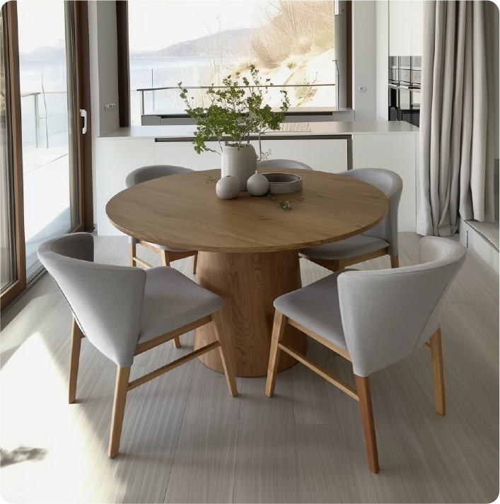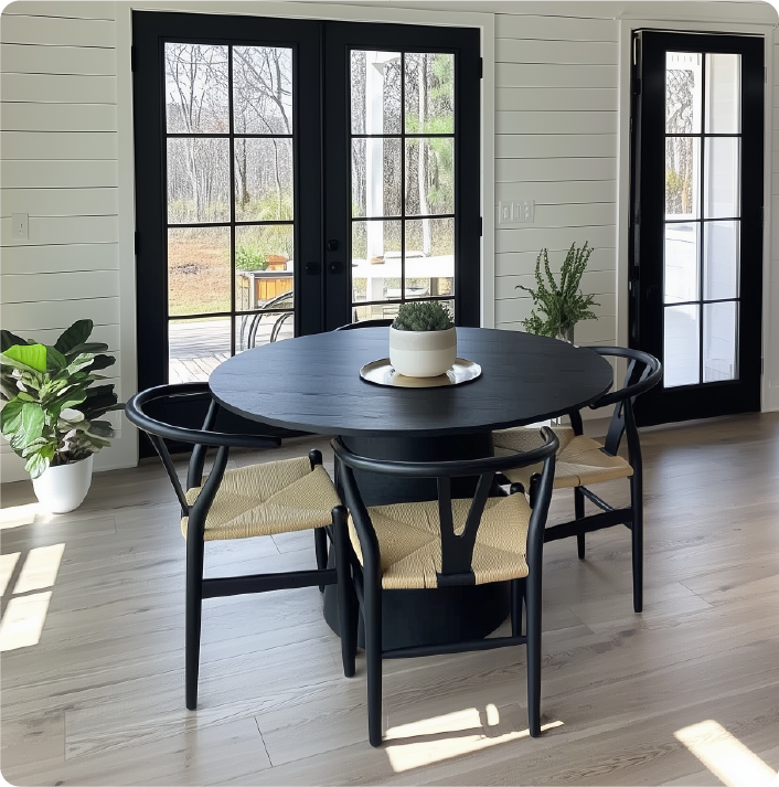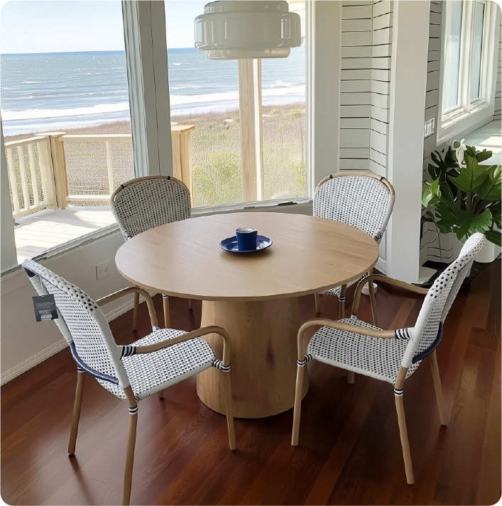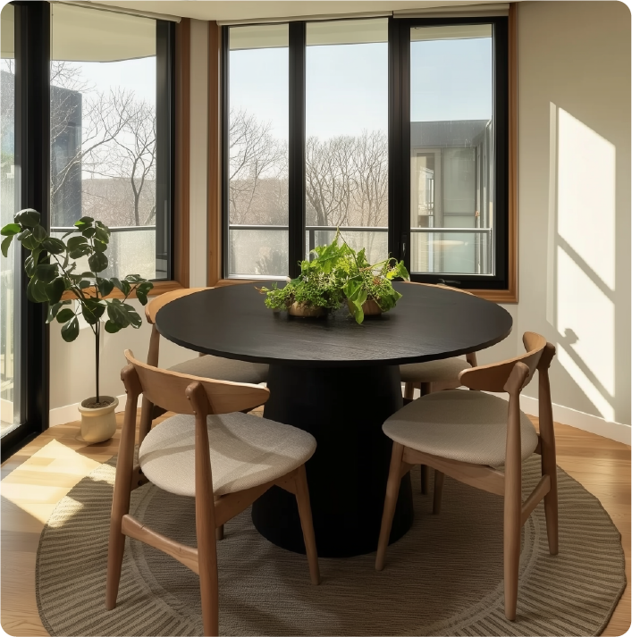 Dwen Modern Round Pedestal Dining Table in cozy dining room, wicker lamp, floor-to-ceiling windows.