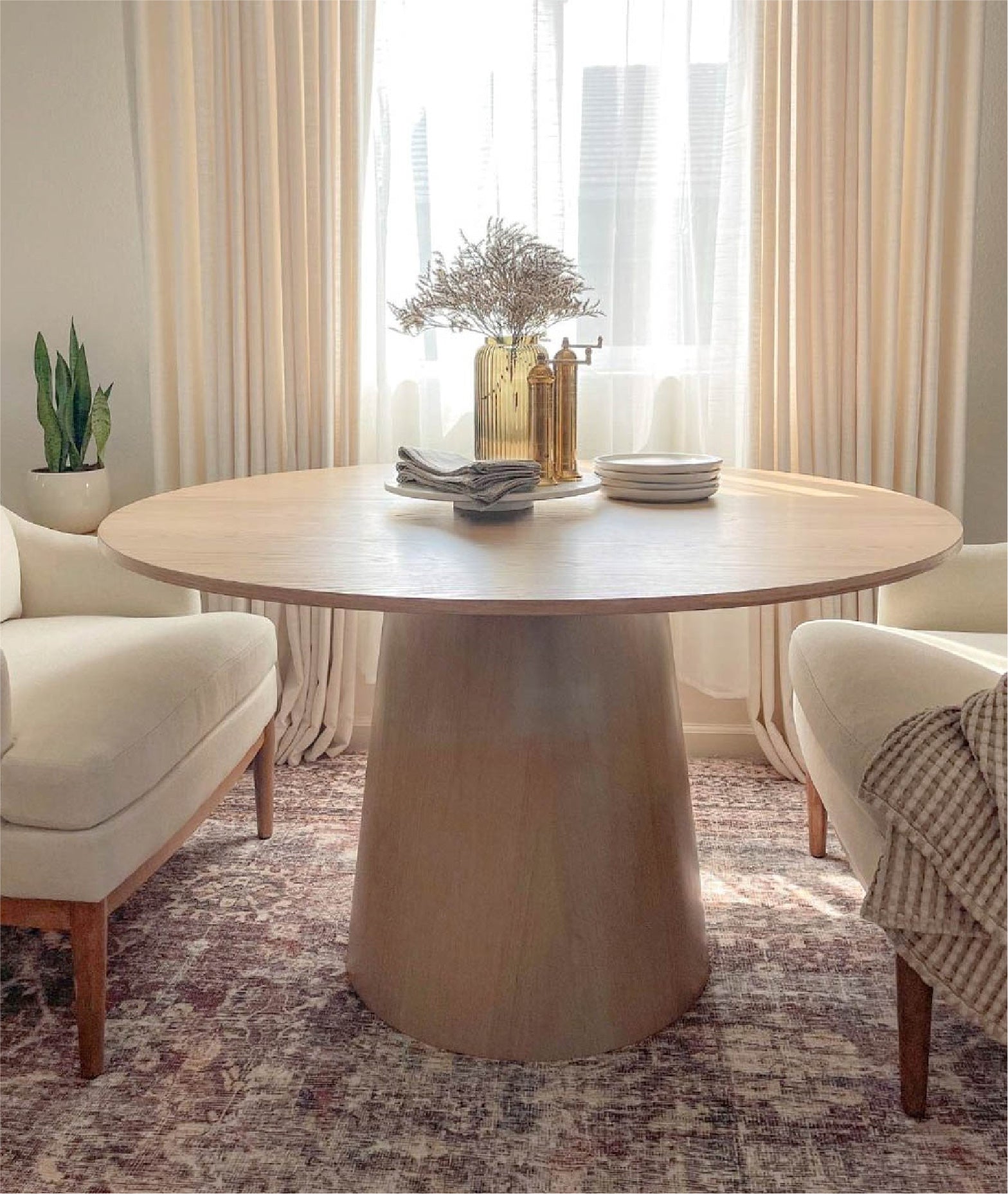 Dwen Round Pedestal Dining Table in modern room with wooden flooring and patterned rug.