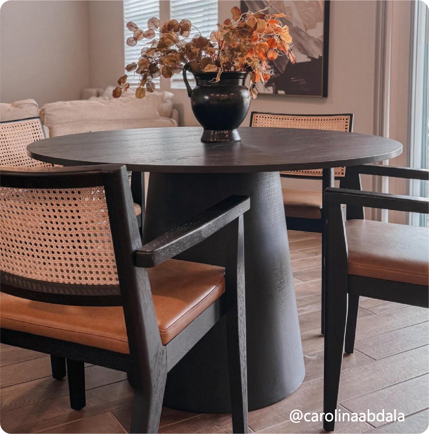 Dwen Pedestal Dining Table with dimensions, modern round design, black finish, stylish furniture piece.