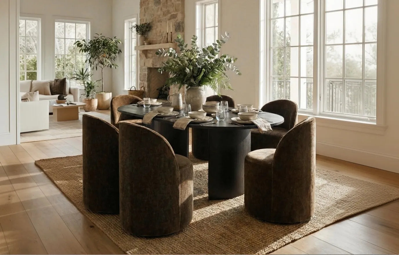 Each chair glides on five hidden casters, swivels for easy access, and cocoons you in plush foam with a gently curved back. Tailored piping and your choice of linen-blend or chenille upholstery add boutique polish. Chairs arrive fully assembled; the table sets up in minutes, no fuss Gather, linger, and turn every meal into a lasting memory—this dining set invites you back to the table again and again.