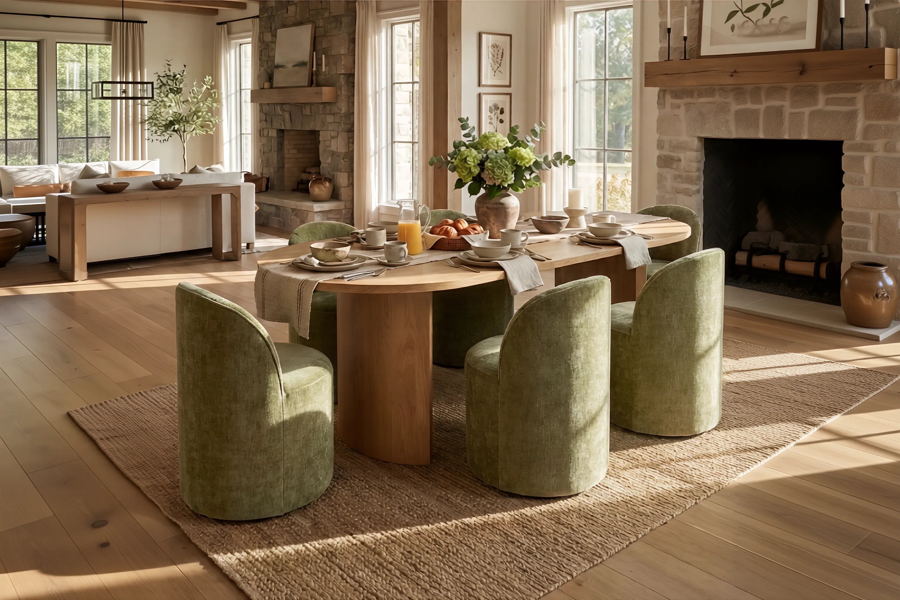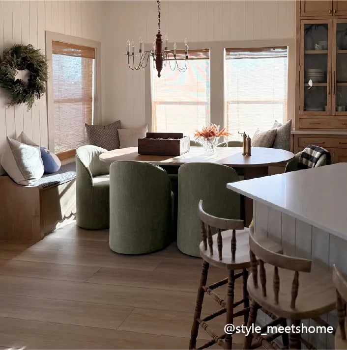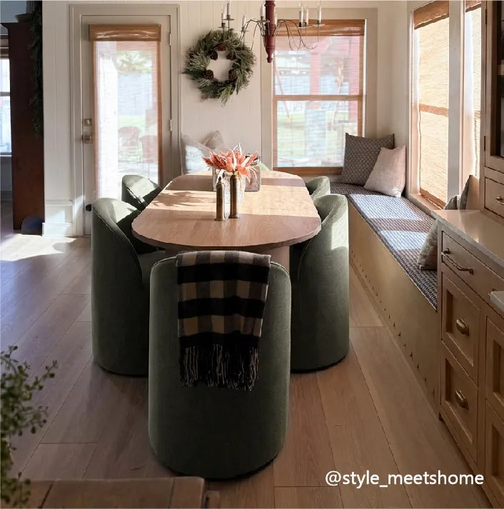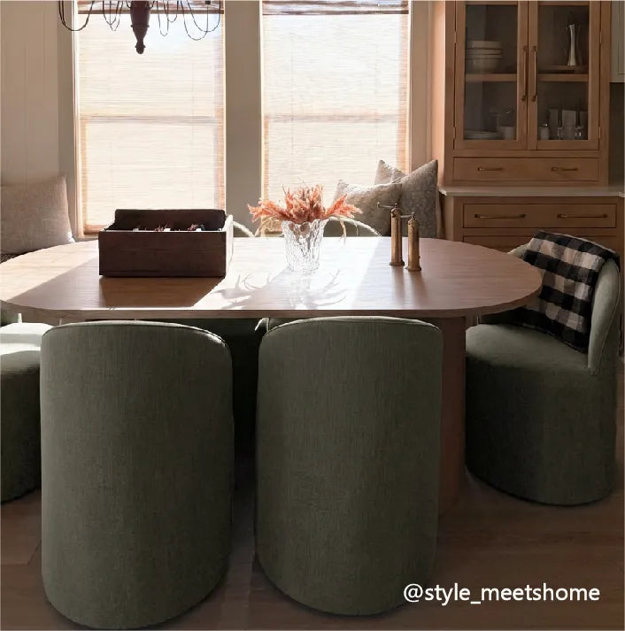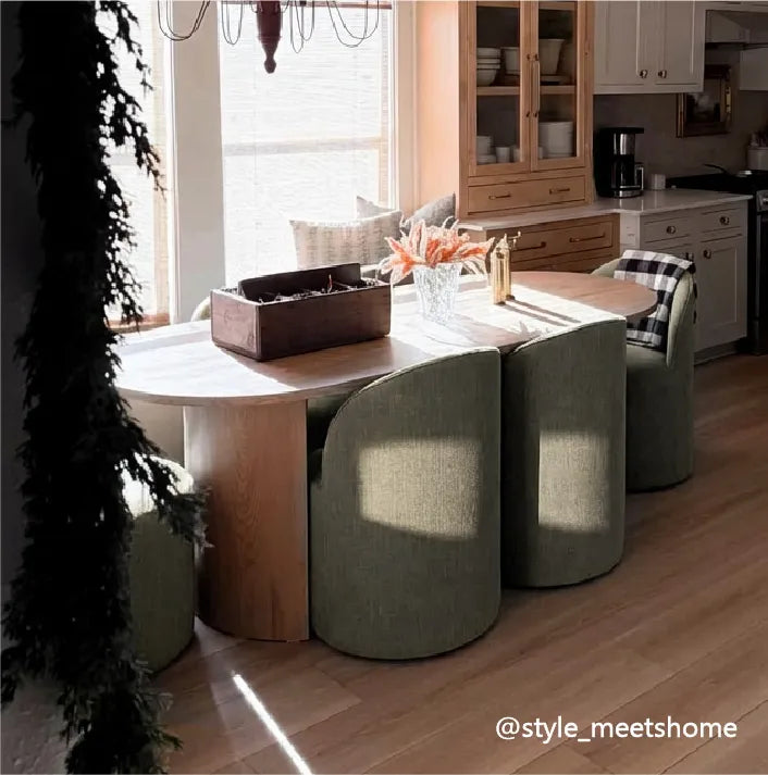 Each chair glides on five hidden casters, swivels for easy access, and cocoons you in plush foam with a gently curved back. The compact barrel silhouette tucks smoothly under the table to keep your space open and effortlessly tidy. Tailored piping and your choice of linen-blend or chenille upholstery add boutique polish. Chairs arrive fully assembled; the table sets up in minutes, no fuss Gather, linger, and turn every meal into a lasting memory—this dining set invites you back to the table again and again.