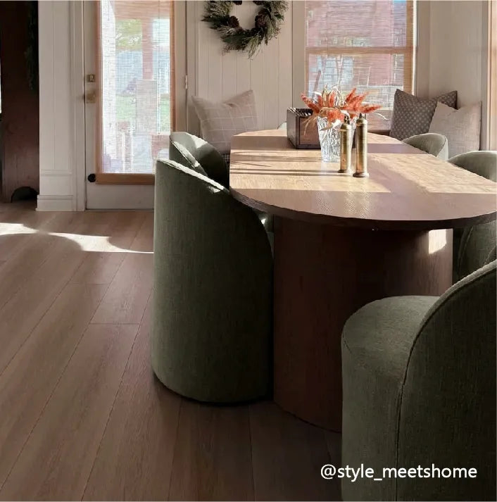 Breathe a quiet sense of luxury into everyday meals with this thoughtfully balanced ensemble. Crafted for effortless gatherings, the set pairs a 79-inch oval table with six swivel barrel chairs. The tabletop—high-density engineered wood in a warm oak-tone veneer—comfortably seats up to eight, while the legs install as either a sculptural pedestal or classic trestle to match your style.