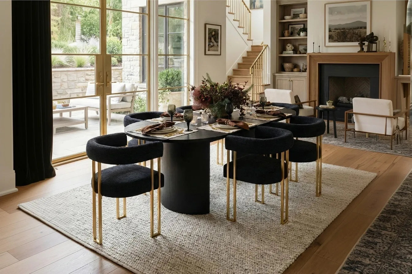 Paired with six generously sized chairs featuring wraparound armrests, soft chenille upholstery, and supportive foam padding, the set delivers exceptional comfort. Polished gold-finished metal frames add a refined, contemporary touch, making this set a warm and inviting centerpiece for both everyday meals and special gatherings.