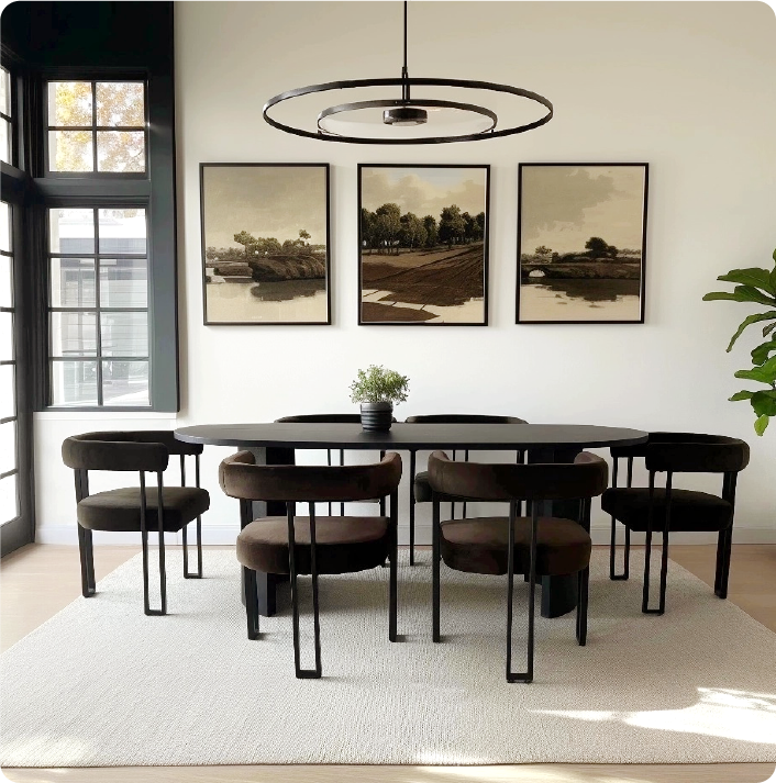 Paired with six beautifully upholstered chairs, each featuring rich 330g velvet and solid metal legs, this set combines style and durability. We especially love the chocolate brown finish—warm, cozy, and timeless. If you love this tone, explore more in our Chocolate Brown Collection. The chairs' 28-inch height allows them to easily slide under the table, creating a clean, spacious look while providing long-lasting comfort with their sturdy wood frame and thick foam cushioning. Whether used for dining or as accent seating, these chairs seamlessly blend into any space.This complete dining set is the perfect balance of contemporary design, comfort, and functionality—creating a welcoming space for unforgettable moments.