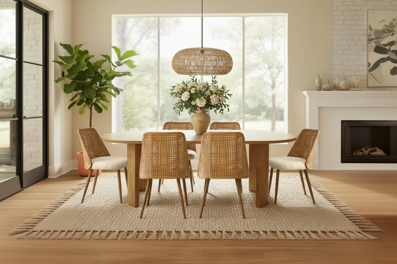 Bring modern warmth to your dining space with a cohesive set that balances style and everyday ease. The 79" oval table is built from high-density engineered wood with a paper veneer for a clean, wood-look finish, seating up to eight and offering two leg configurations to suit your style. Its softly rounded shape visually opens up the room.
