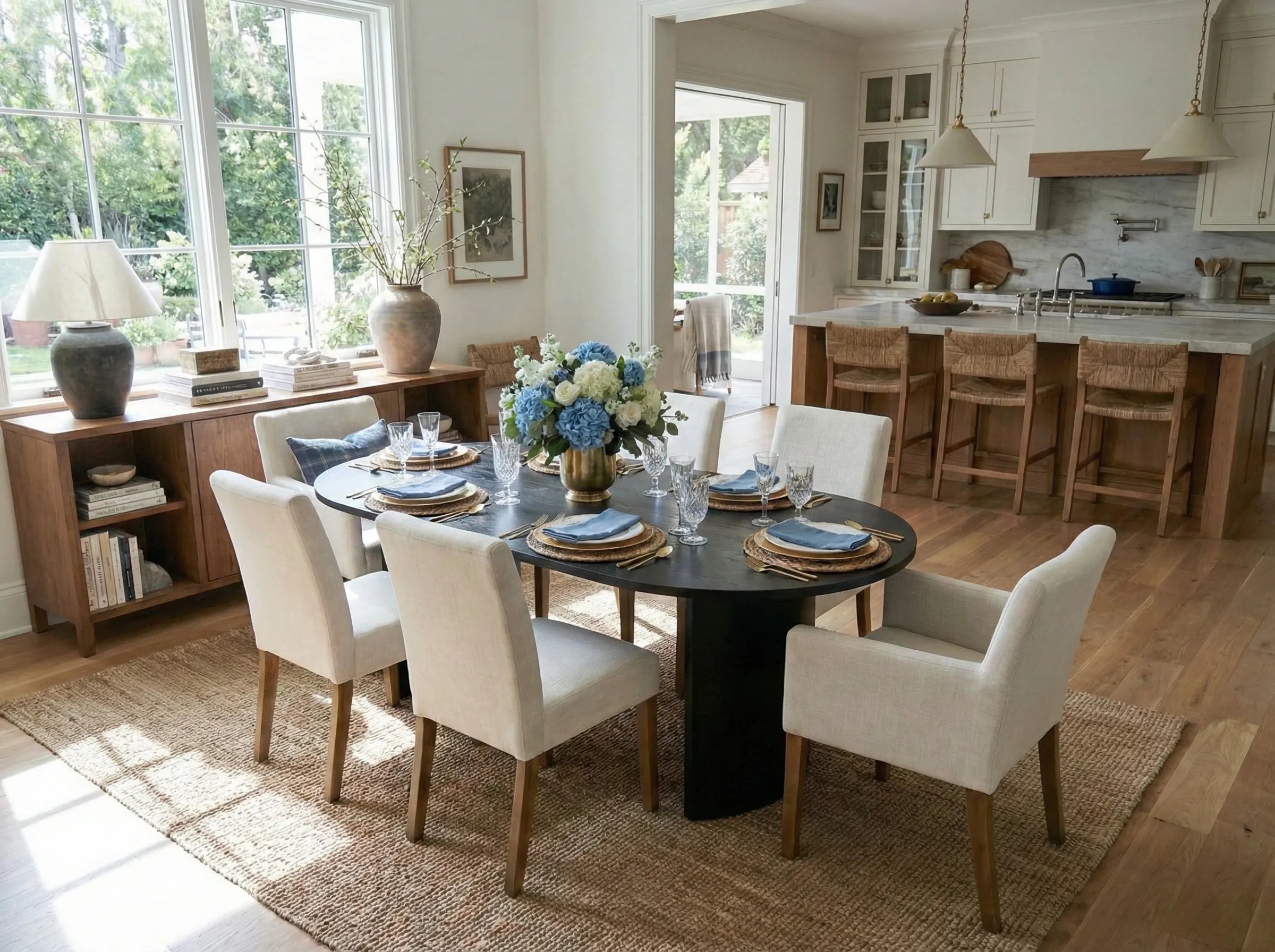 This complete dining set blends natural materials with modern design to create a bright, welcoming dining space. The 79" oval table is crafted from high-density manufactured wood with a smooth paper veneer, offering generous surface area to comfortably seat up to eight people. Its modern oval silhouette visually opens up the room, making it ideal for open kitchens and dining areas. The table legs can be installed in two different configurations, allowing you to tailor the look to your personal style. Paired with six upholstered chairs, the set delivers everyday comfort with premium linen-blend upholstery that feels soft, breathable, and refined. Natural rubberwood legs provide sturdy support and a warm, organic finish, while the ergonomic high back—slightly wider and gently curved at the top—offers a supportive, body-hugging feel for relaxed, lingering meals.