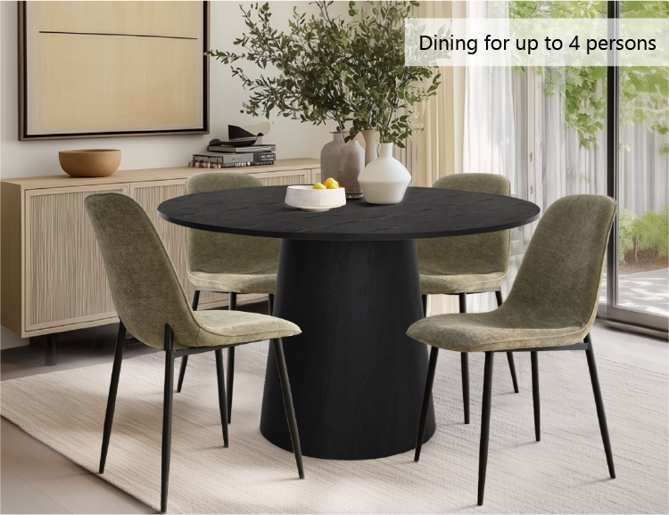The Dwen 5-piece Round Dining Set is perfect for casual meals or cozy coffee chats, comfortably seating 4 people. It includes a round table with a pedestal base and four matching dining chairs, The table crafted from High-density manufactured wood with a warm, inviting finish. The chairs feature angled, tapered metal legs, adding a sleek modern touch. The seats and scoop backs are upholstered in polyester with foam filling, providing excellent support for long sitting sessions.
