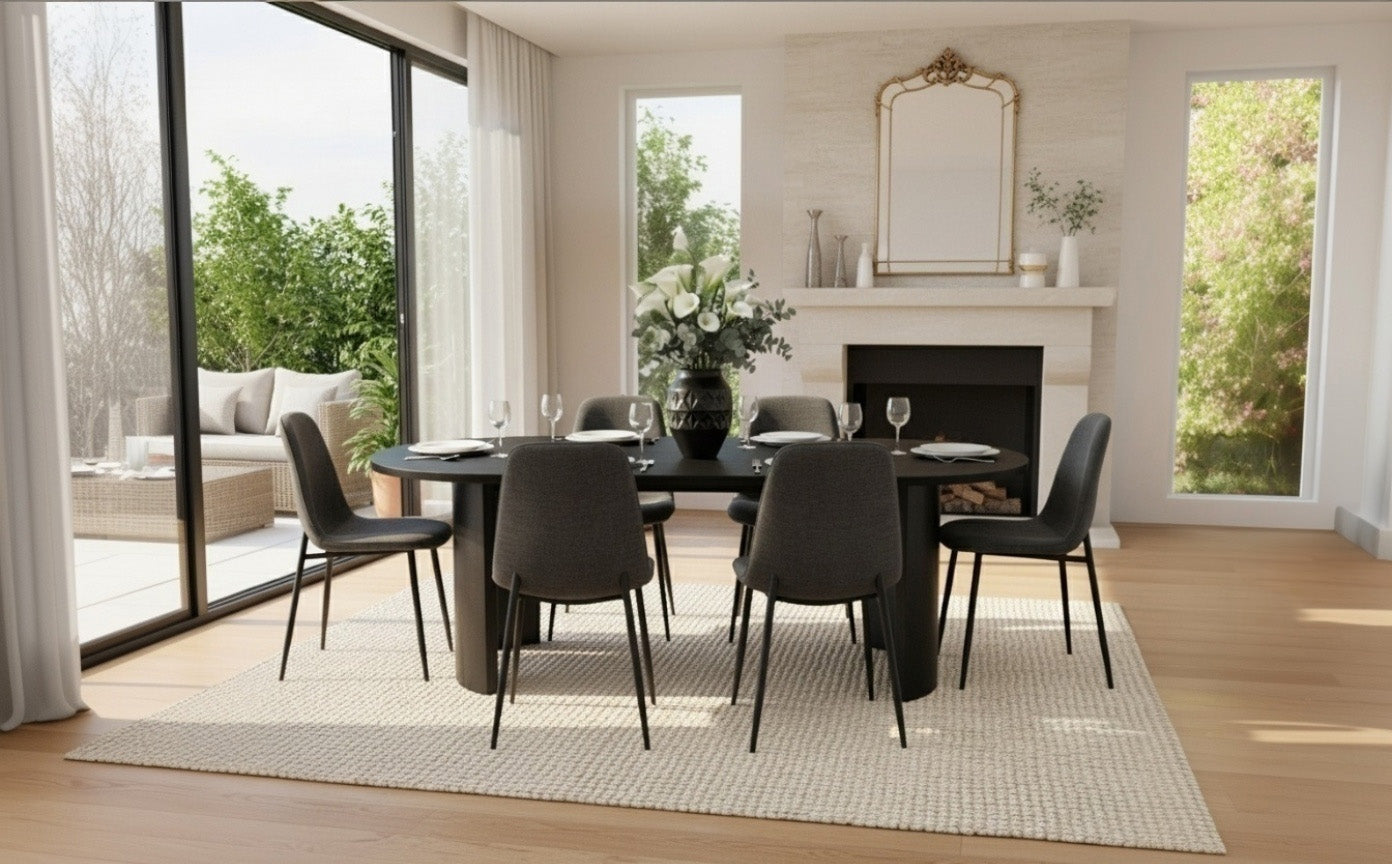 The chairs perfectly complement the table, available in two elegant options: black metal legs with chenille fabric for a refined, soft touch, or metal legs with a light oak wood grain finish and textured fabric upholstery. Thick foam cushions and a stylish exposed backrest frame ensure both comfort and modern appeal. Easy to assemble, beautiful and practical.