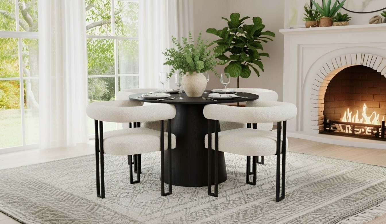 Dwen & Rola 46" Round Black & Boucle Dining Table Set for 4 (5-Piece)