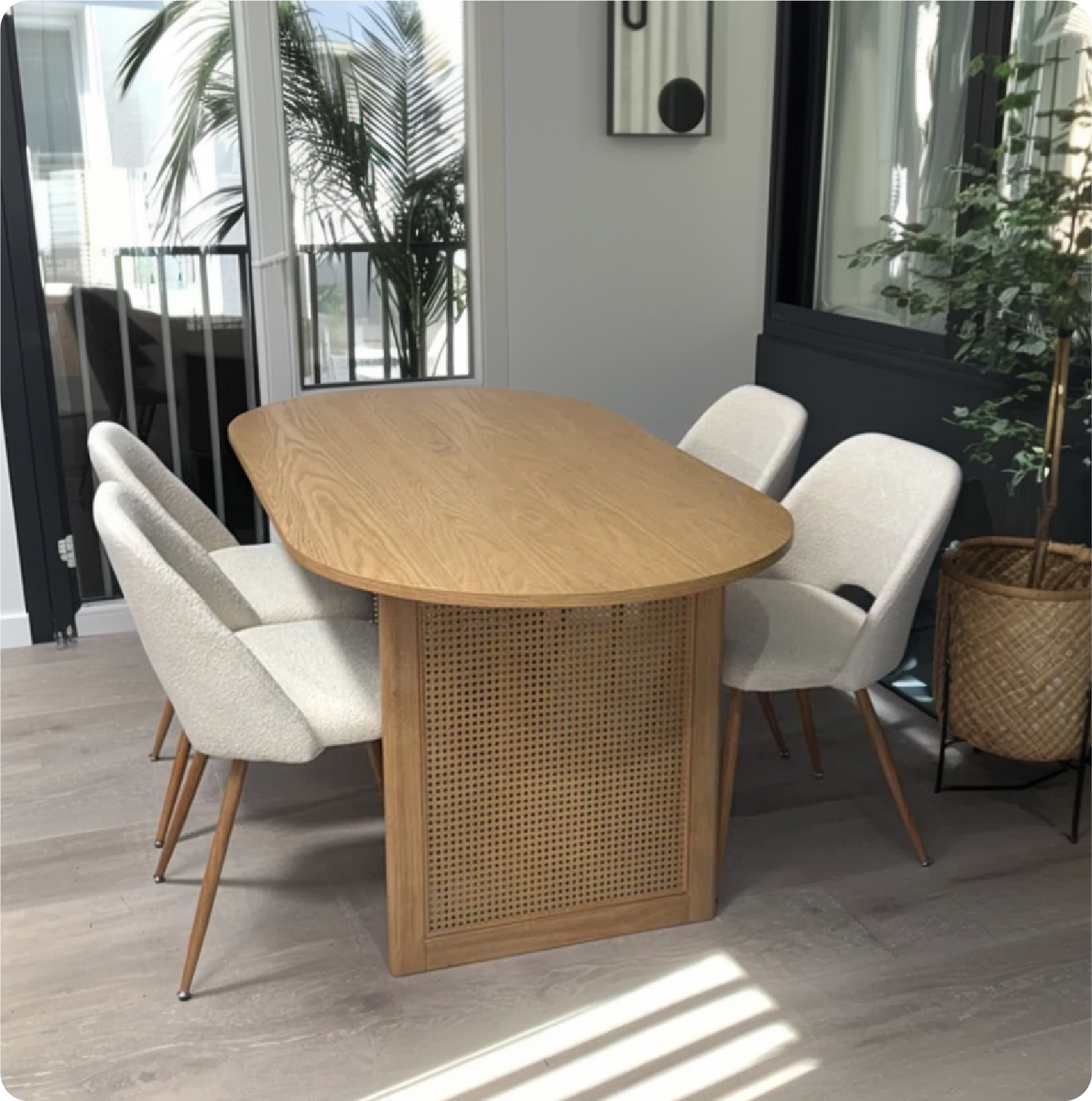 If we had to choose, this might just be our designer's favorite version of the Edwin series. The bouclé fabric is so on-trend, paired with legs featuring a soft oak wood grain pattern. The light, natural tones and beautiful texture make it a perfect addition to a bright, sunny dining room—it’s the kind of piece that instantly lifts your mood just by looking at it!