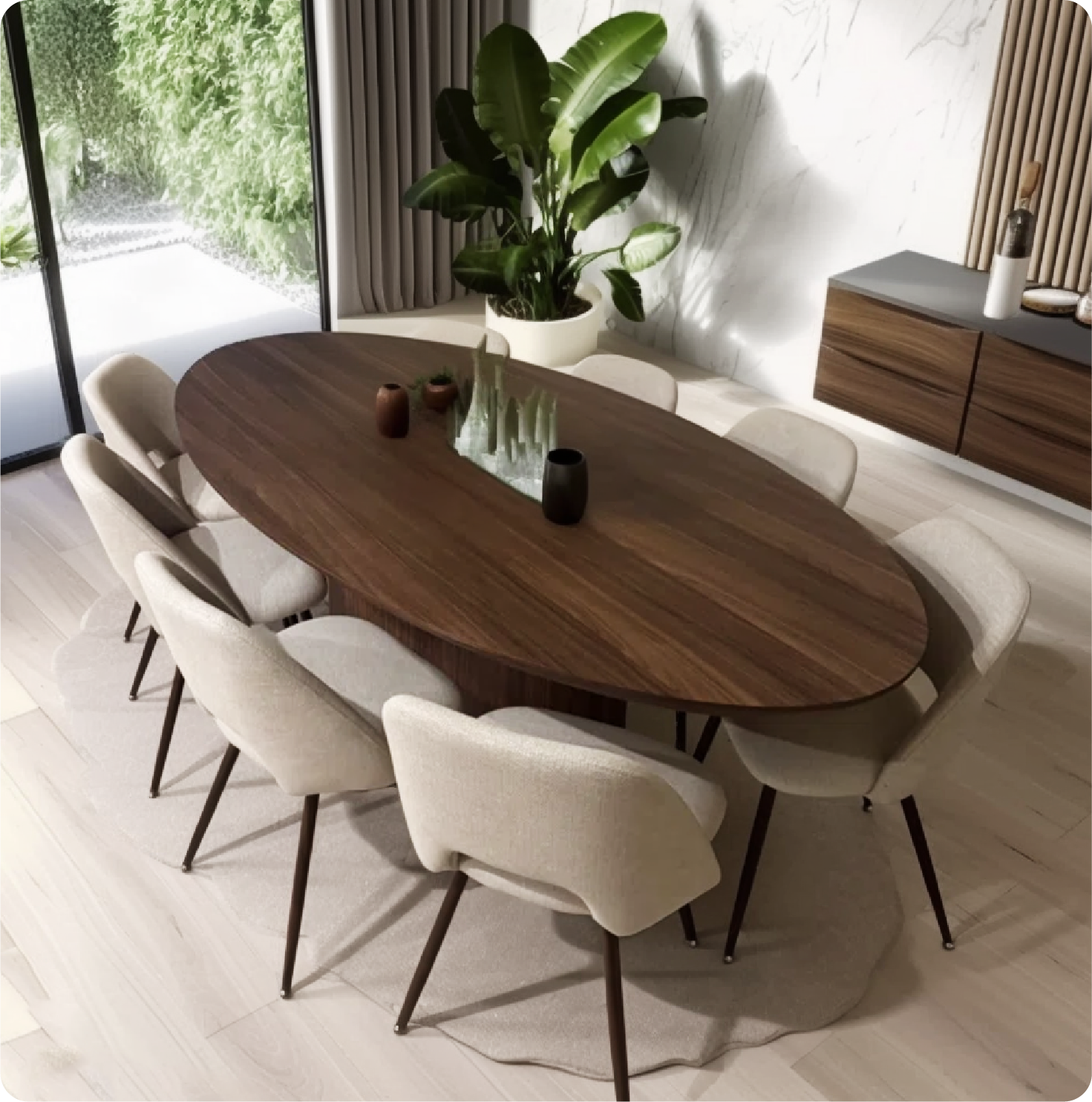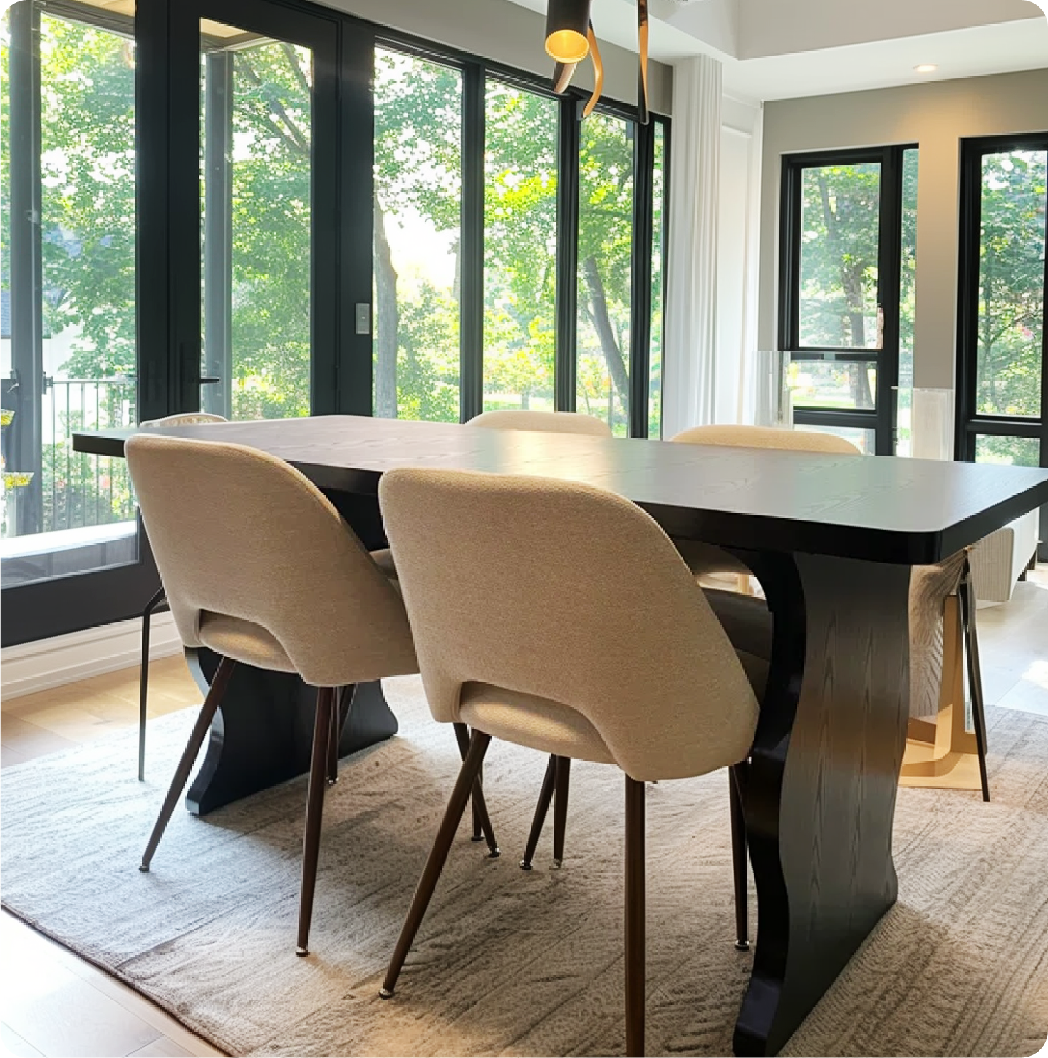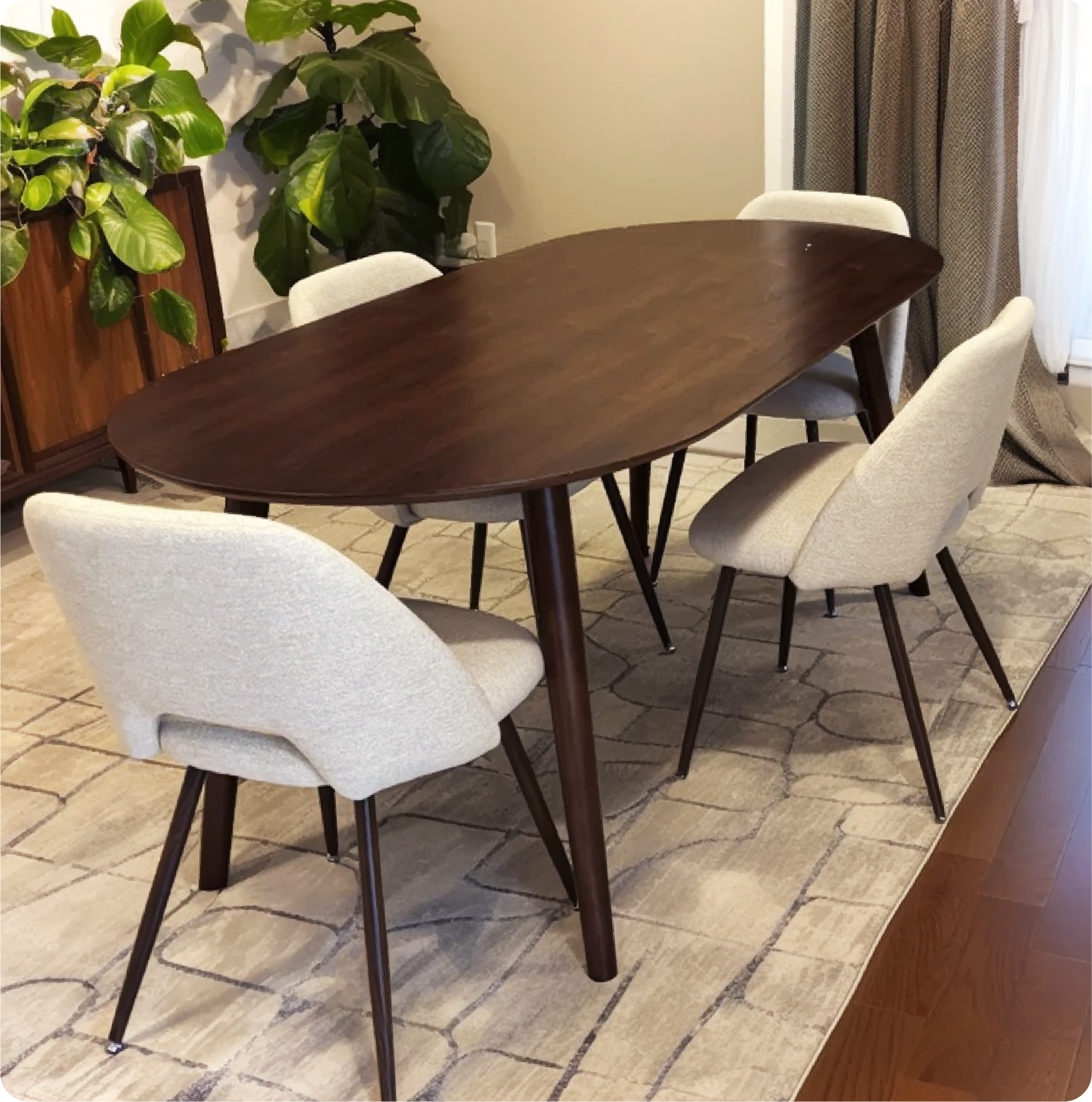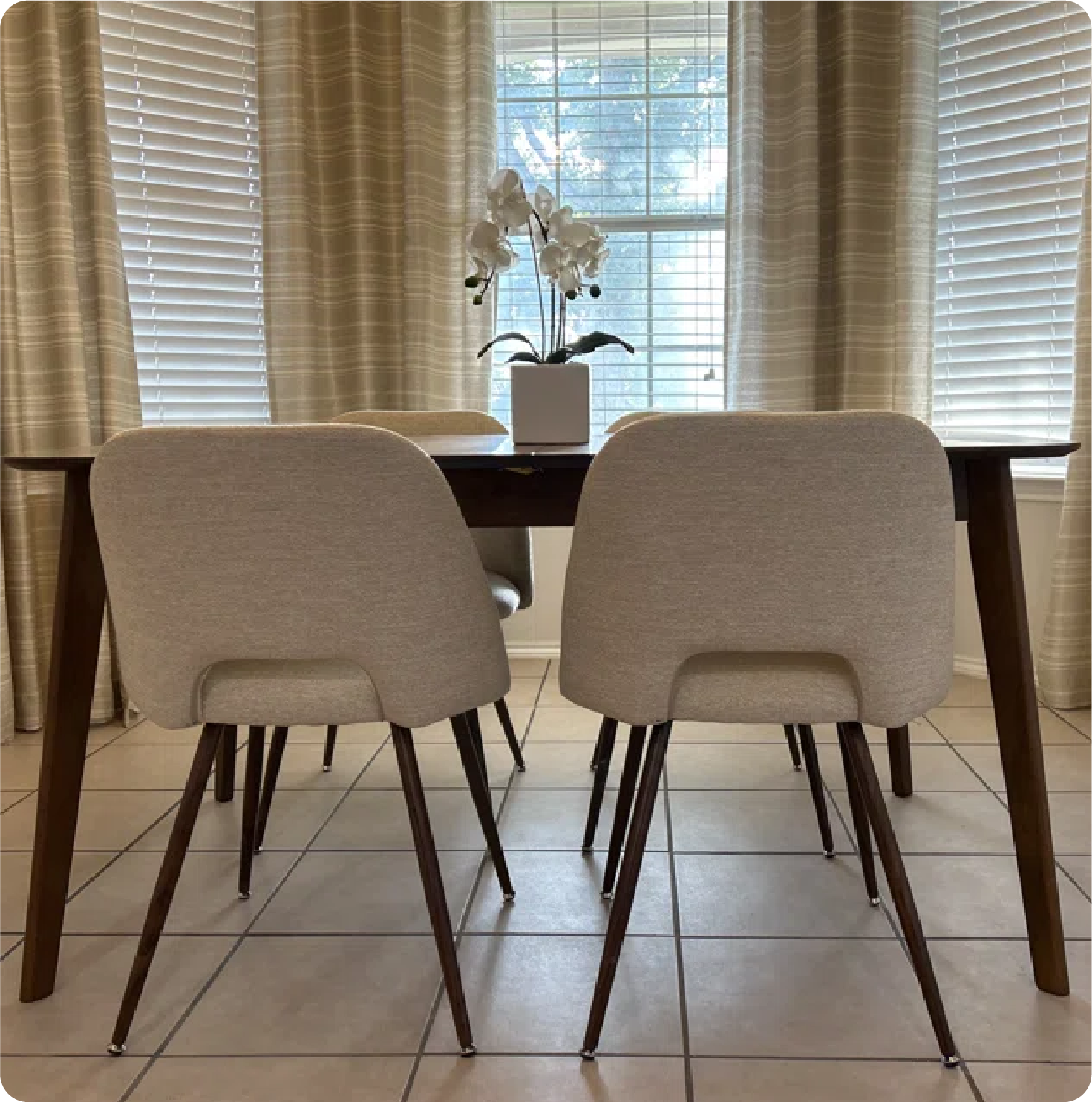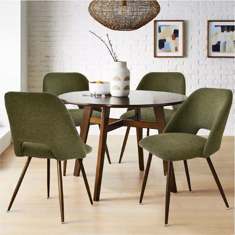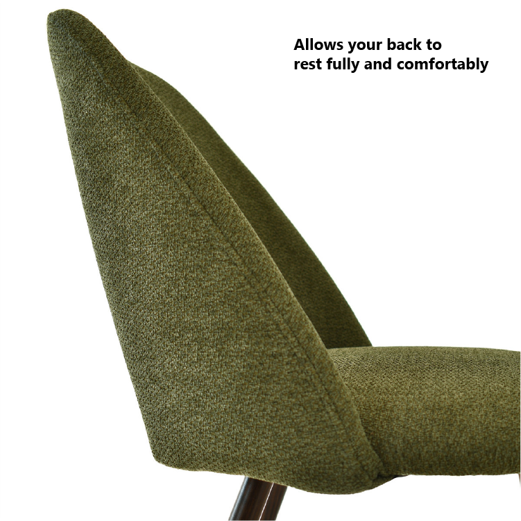 The fabric is a textured chenille with a clear weave pattern that's both elegant and practical—it hides stains easily! The standout feature of this chair is its curved backrest with a cut-out detail. The design allows your back to rest fully and comfortably, making long meals with family and friends a delight.