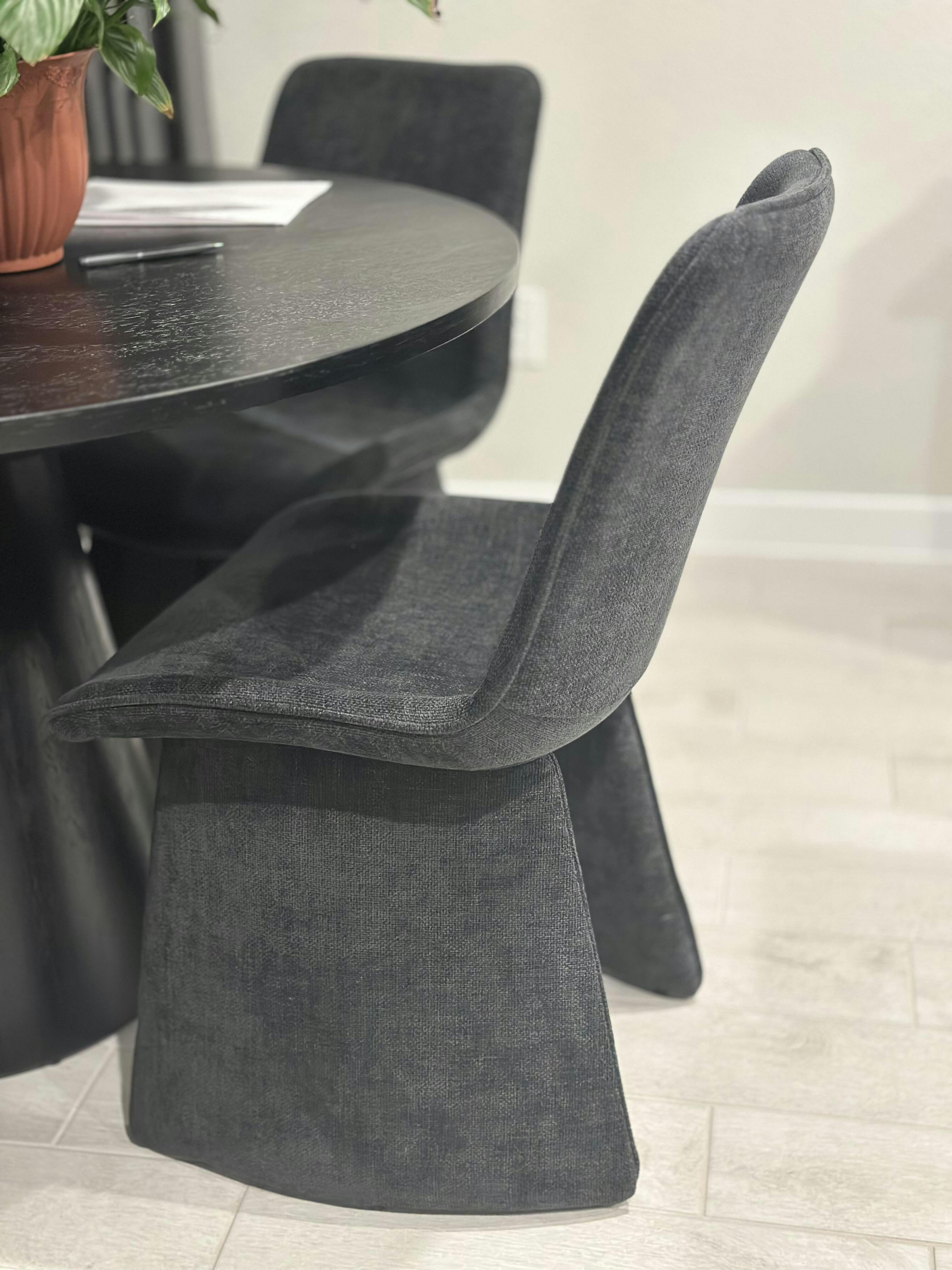 Equal parts art and comfort, this dining chair pairs flowing curves with a fully upholstered silhouette. Wrapped in smooth, soft-touch fabric, it offers supportive seating for lingering meals or late-night conversations. Available in four chic colors—Beige, Black, Green, and Taupe—it complements interiors that balance style and warmth.