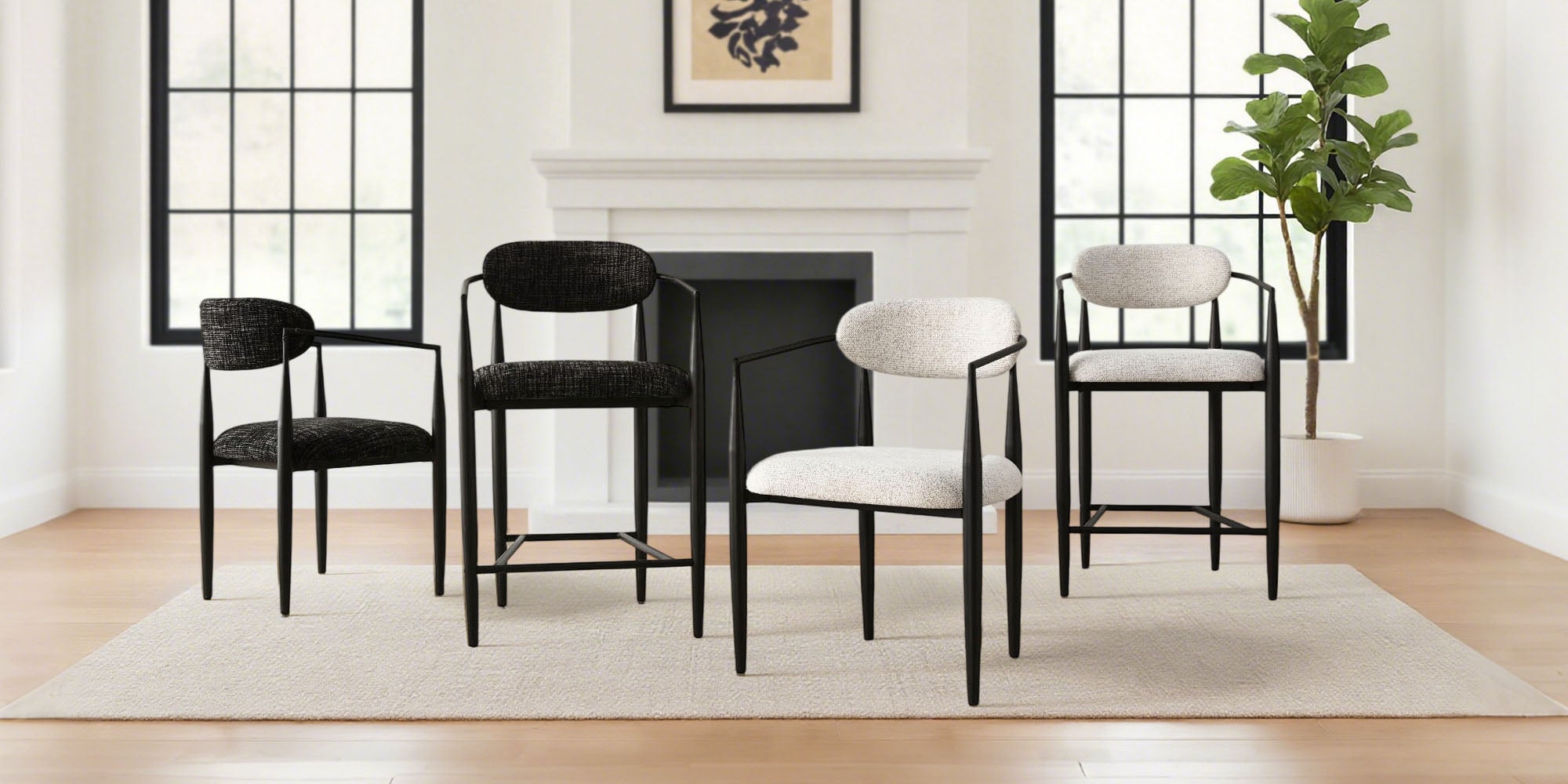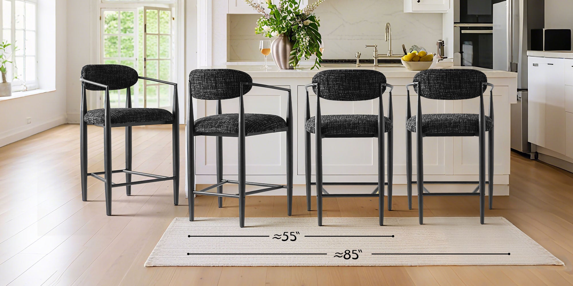 The Manhattan Counter Stool elevates your kitchen or dining area with a blend of modern minimalism and everyday comfort. Its sleek black metal frame and sculptural curved backrest create a clean, contemporary silhouette, while the soft textured fabric seat and back provide inviting support. The exceptionally wide 22" seat delivers superior comfort compared to standard stools, making it ideal for relaxed dining or extended seating. With ergonomic armrests, a supportive footrest, and a versatile 25.5" seat height, this stool fits most counters and islands with ease. Durable yet lightweight, it pairs beautifully with marble or wooden surfaces, adding understated sophistication to any modern home.