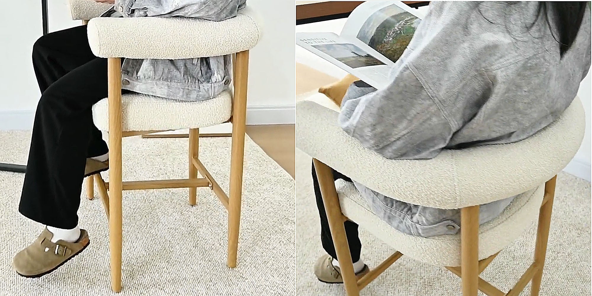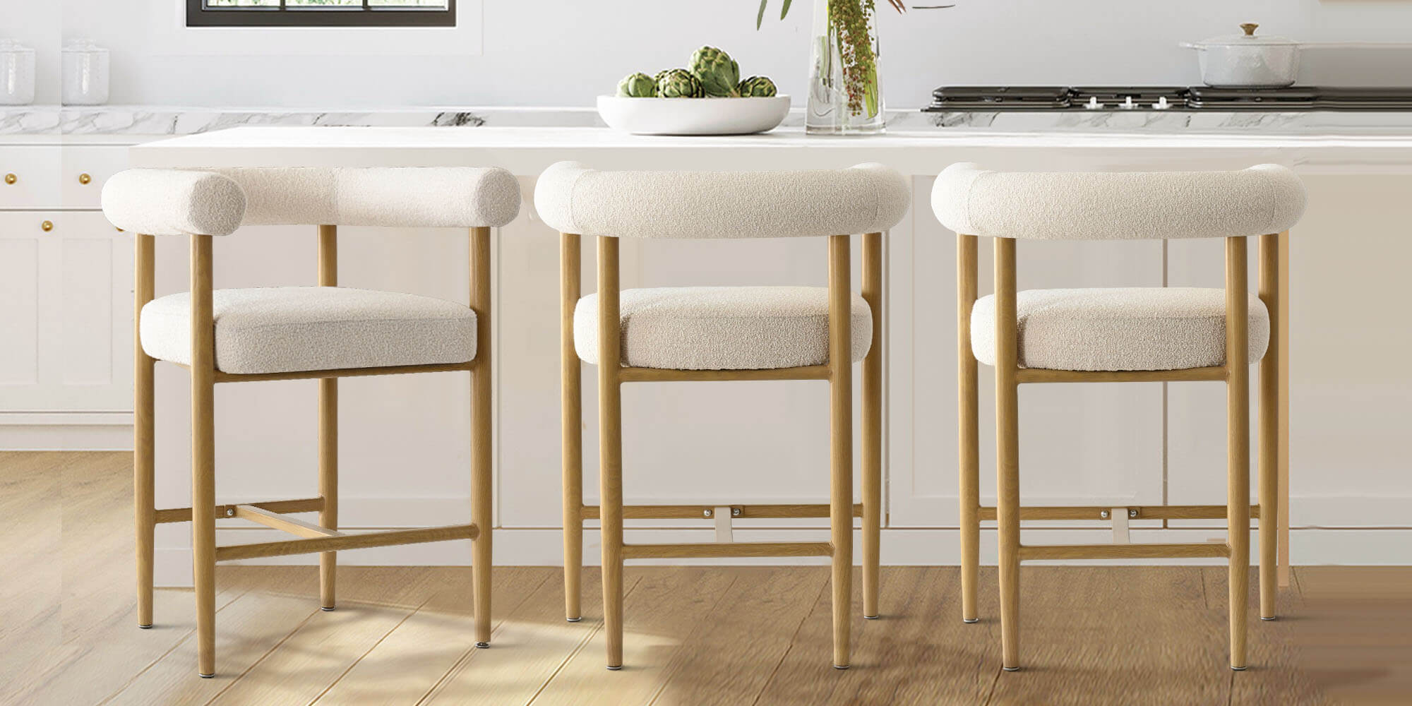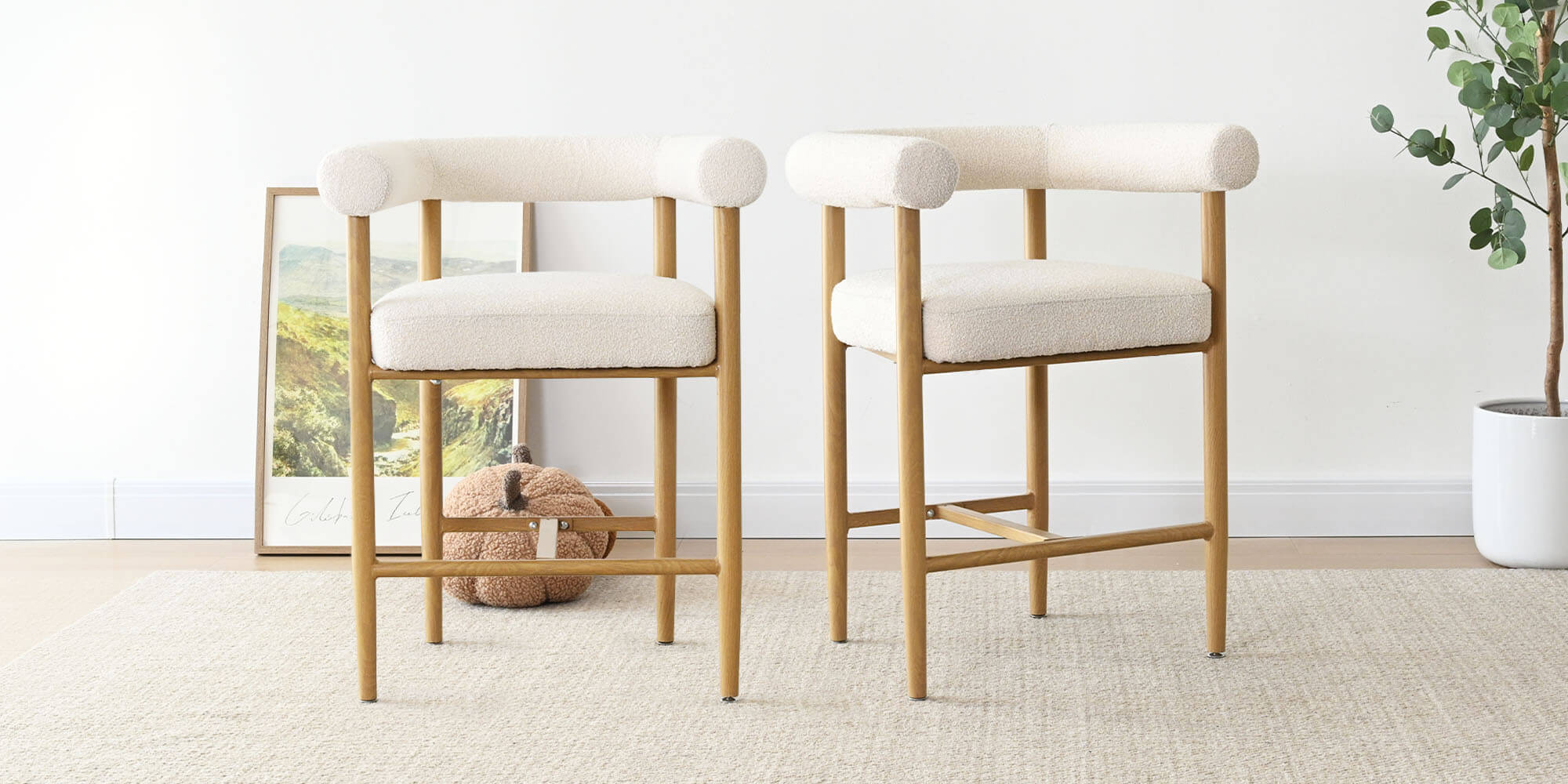 Wrapped in soft white bouclé fabric, this counter stool balances elegance with everyday comfort. The gently curved high-back design embraces you, while subtly flared low arms keep the look light and modern.