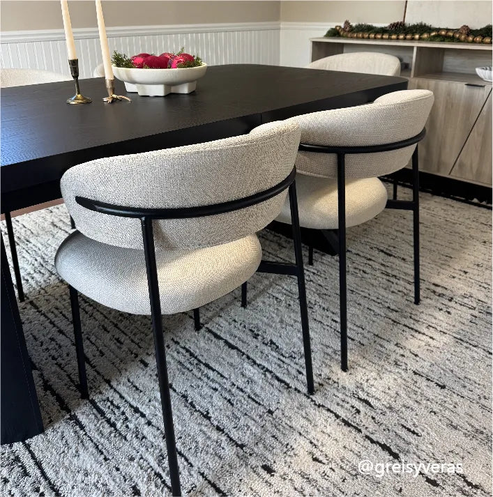 This dining chair blends style and comfort effortlessly. Upholstered in Elegant Fabric, the 100% polyester material ensures durability and easy upkeep. The seat and backrest are cushioned with high-quality foam for excellent support, while sleek black metal legs add a sophisticated touch. Compact in size, this chair fits seamlessly into any space, accommodating all. Perfect for your dining area, it combines both elegance and functionality. Assembly required.This version makes the description more concise and focuses on the key selling points.