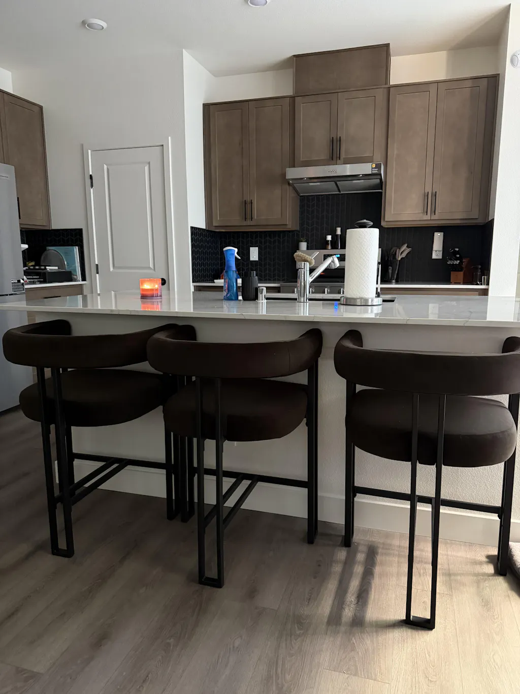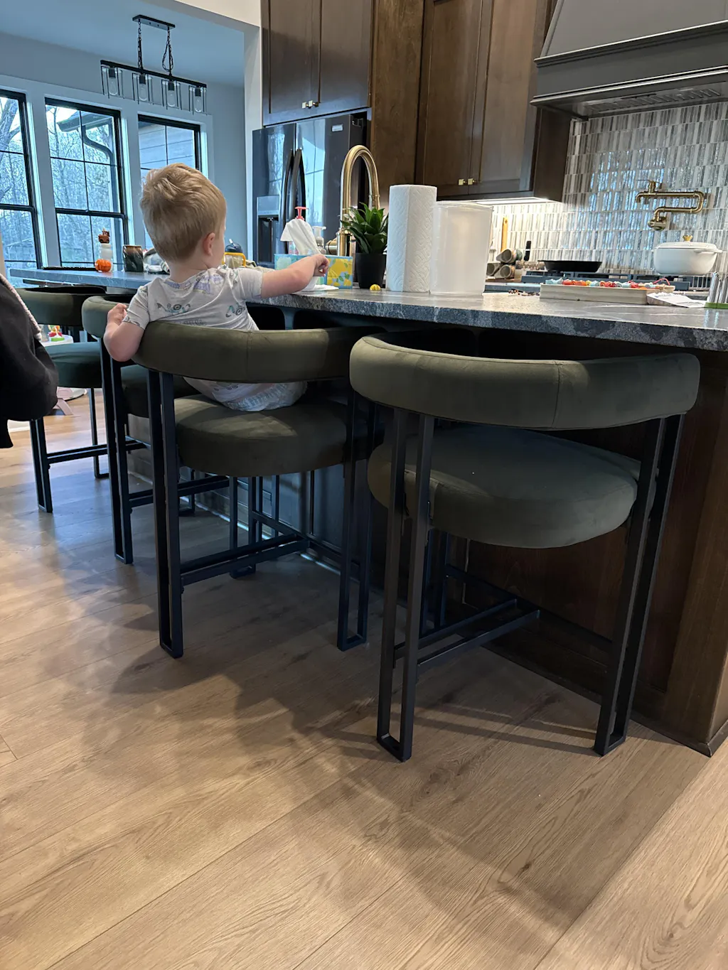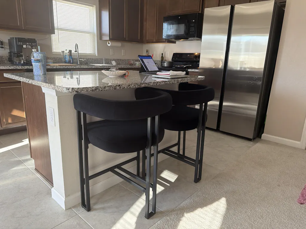 We designed the overall height to be just right at 33.5", so you can easily slide it completely under your kitchen island. This keeps your kitchen looking clean and tidy while still giving you plenty of room to relax. The sleek design looks gorgeous from the back, creating a stylish, cohesive vibe when lined up at your kitchen island.