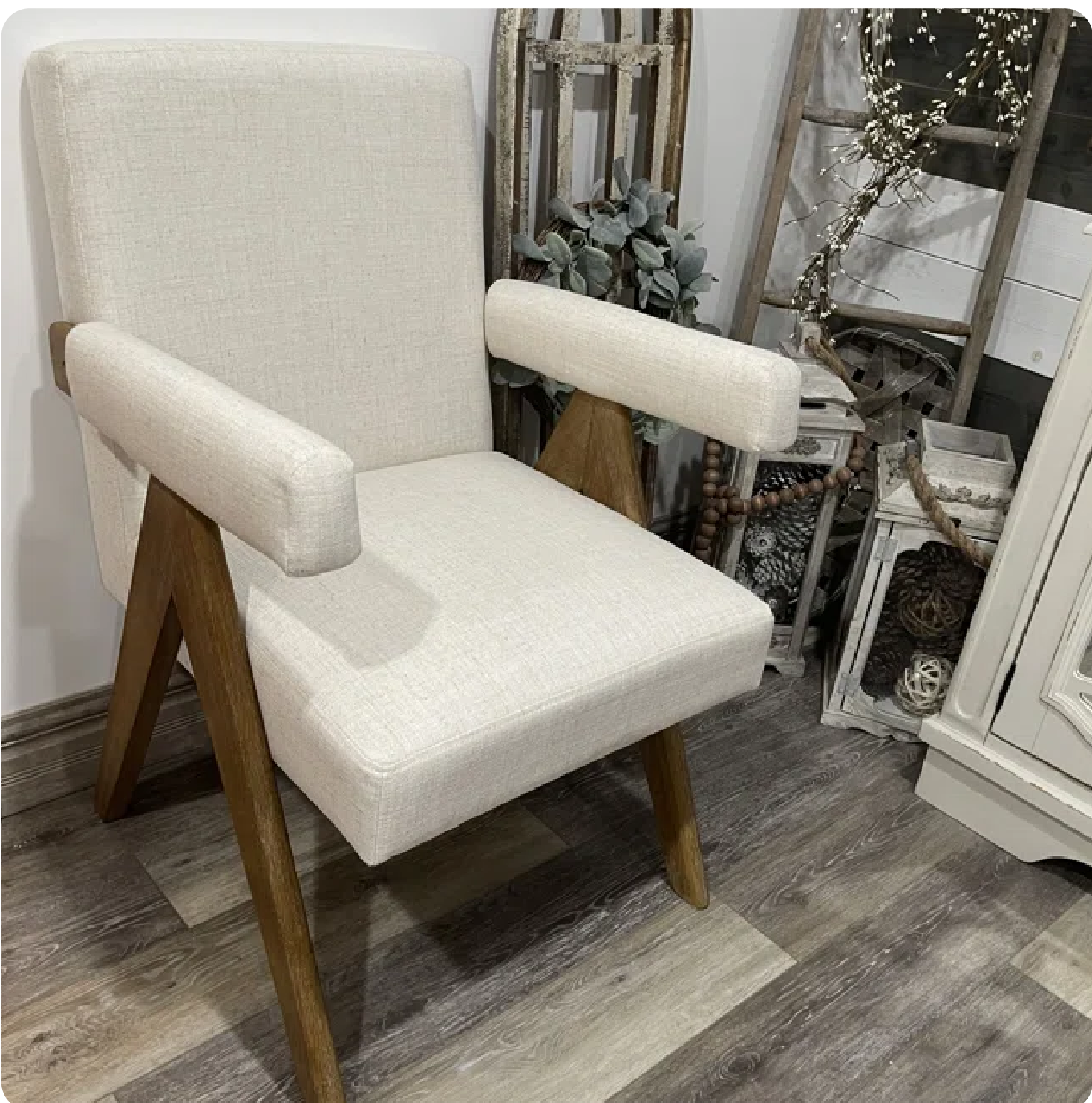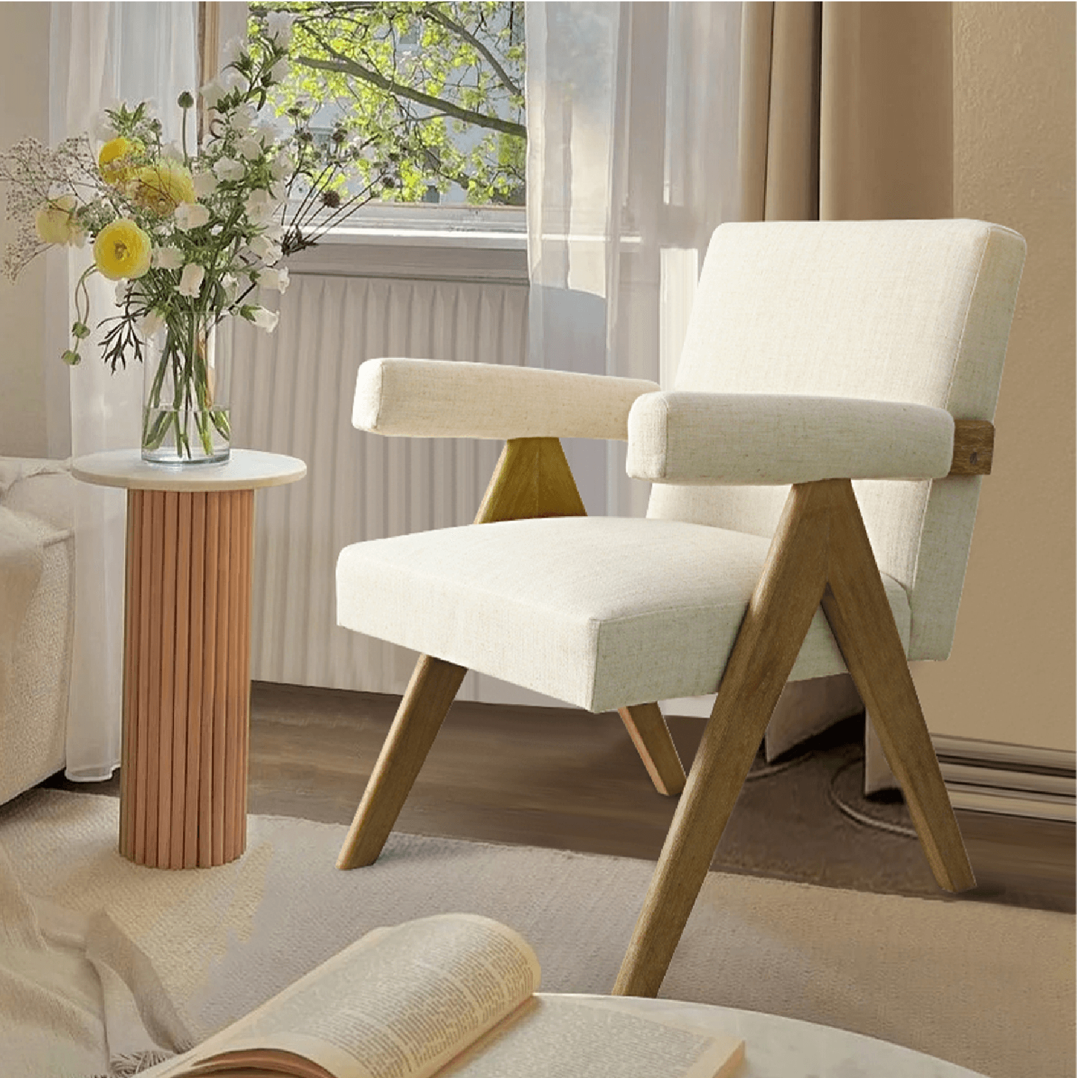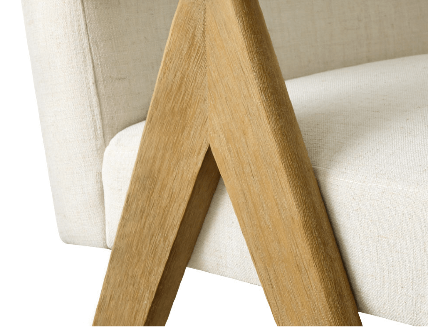 The whitewashed finish on the solid rubber wood legs adds a rustic patina, perfectly complementing the fabric. And let's talk about those inverted V-shaped legs—they’re the highlight of the entire series, combining style and stability in one sleek design.