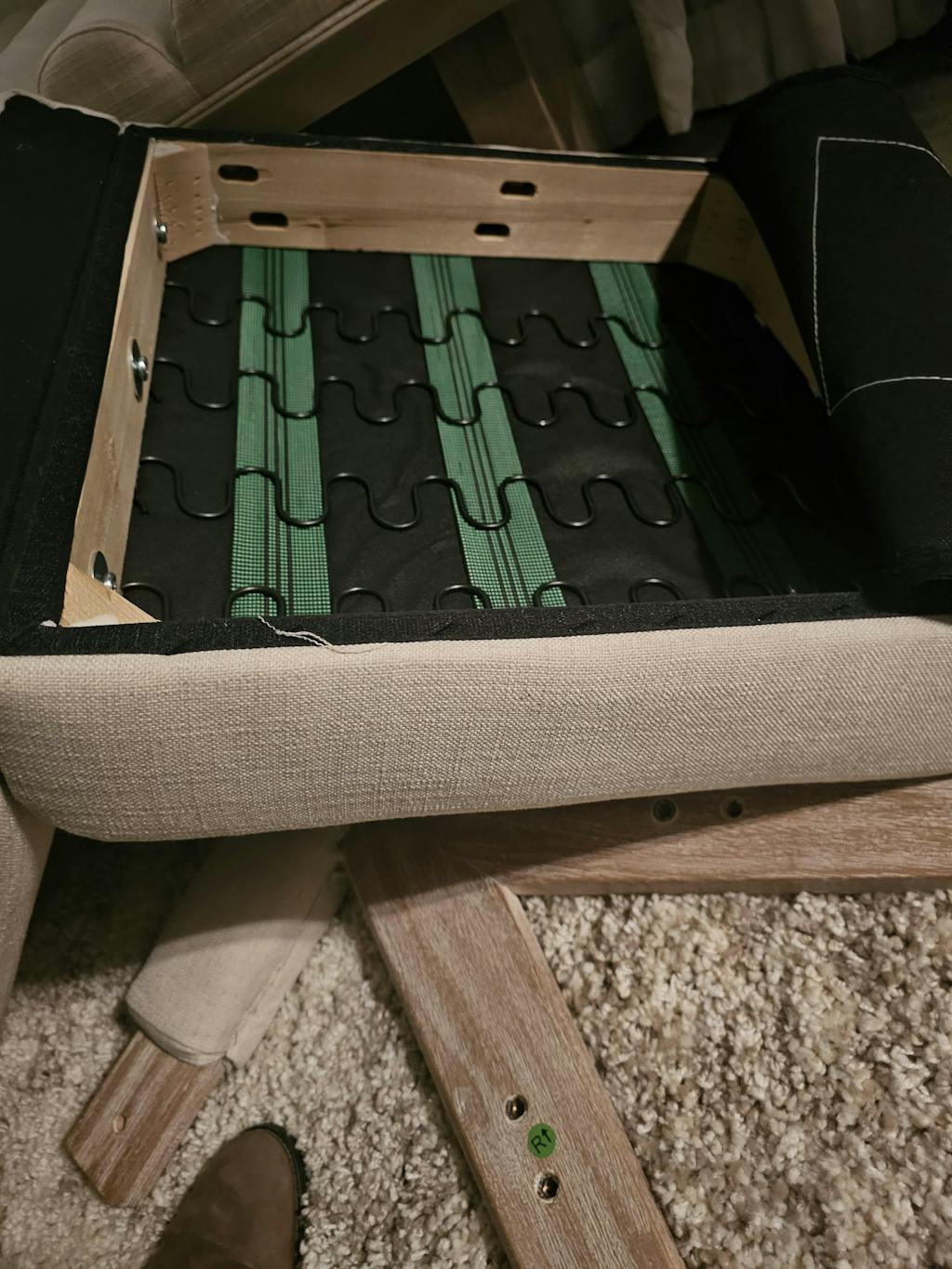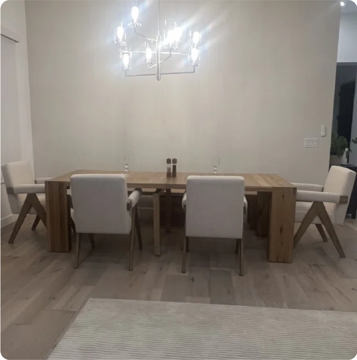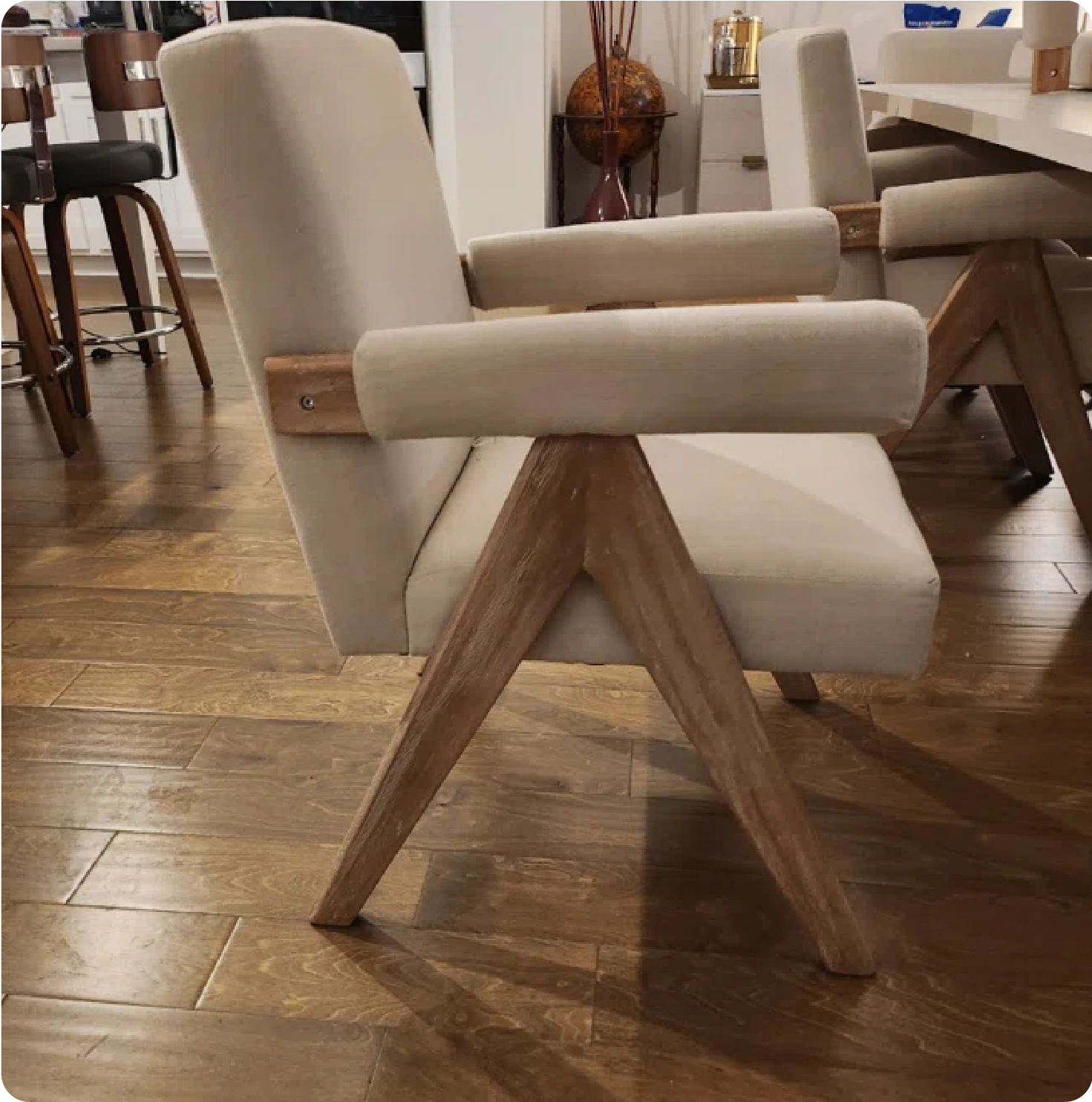 The whitewashed finish on the solid rubber wood legs adds a rustic patina, perfectly complementing the fabric. And let's talk about those inverted V-shaped legs—they’re the highlight of the entire series, combining style and stability in one sleek design.