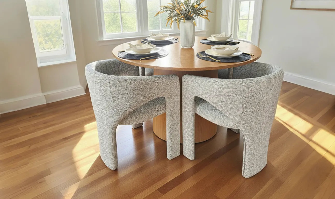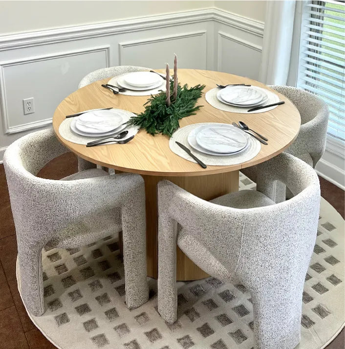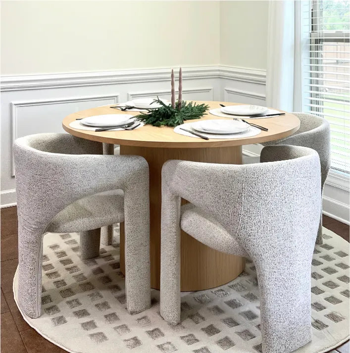 Clean-lined yet expressive, this 5-piece set brings soft geometry and sculptural simplicity to your dining nook. The 41.5" round tabletop pairs with a cylindrical pedestal that frees up legroom and creates a calm, balanced silhouette—assembly is quick: just connect the top to the base. Four upholstered curved-back dining chairs echo the table’s gentle radius with a wraparound seat contour, plush high-density cushion, and a slightly raised front edge that supports the thighs for better posture. The curved back tucks neatly under the table to keep the footprint tidy, while the streamlined profile reads modern without feeling cold. Thoughtful proportions, flowing lines, and everyday comfort—design you can live in, every day.