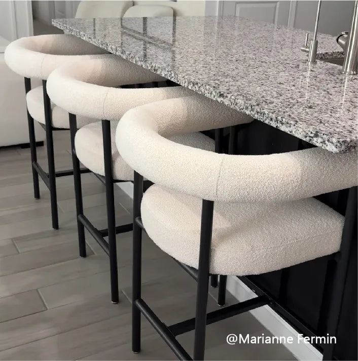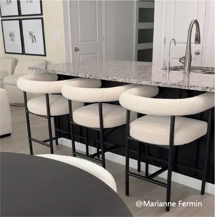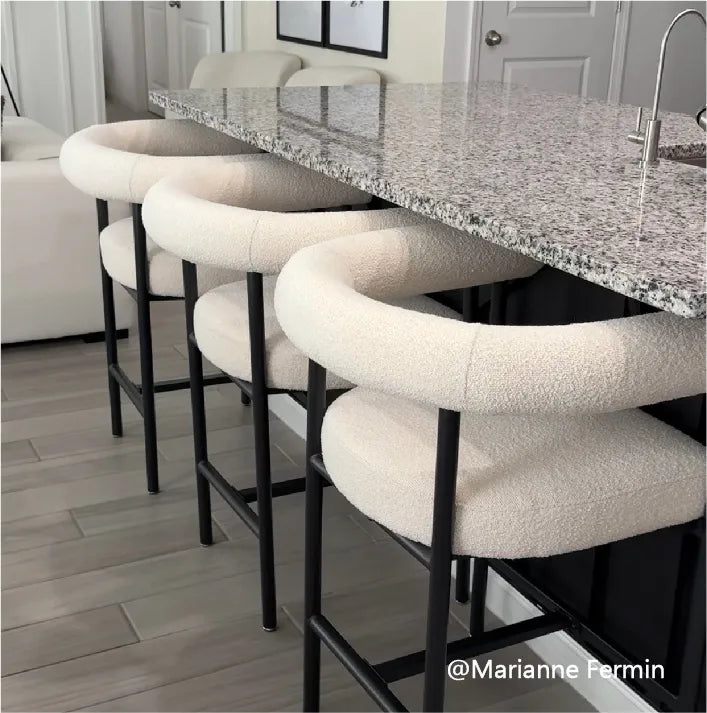 Sleek in black-and-white, this 33" counter stool pairs a sculpted silhouette with soft boucle upholstery, a solid metal frame and sturdy wood seat base, while thick foam padding and armrests invite relaxed lingering; compact yet durable, it tucks neatly under counters and, when teamed with New York-collection chairs, completes a designer look on a savvy budget.
