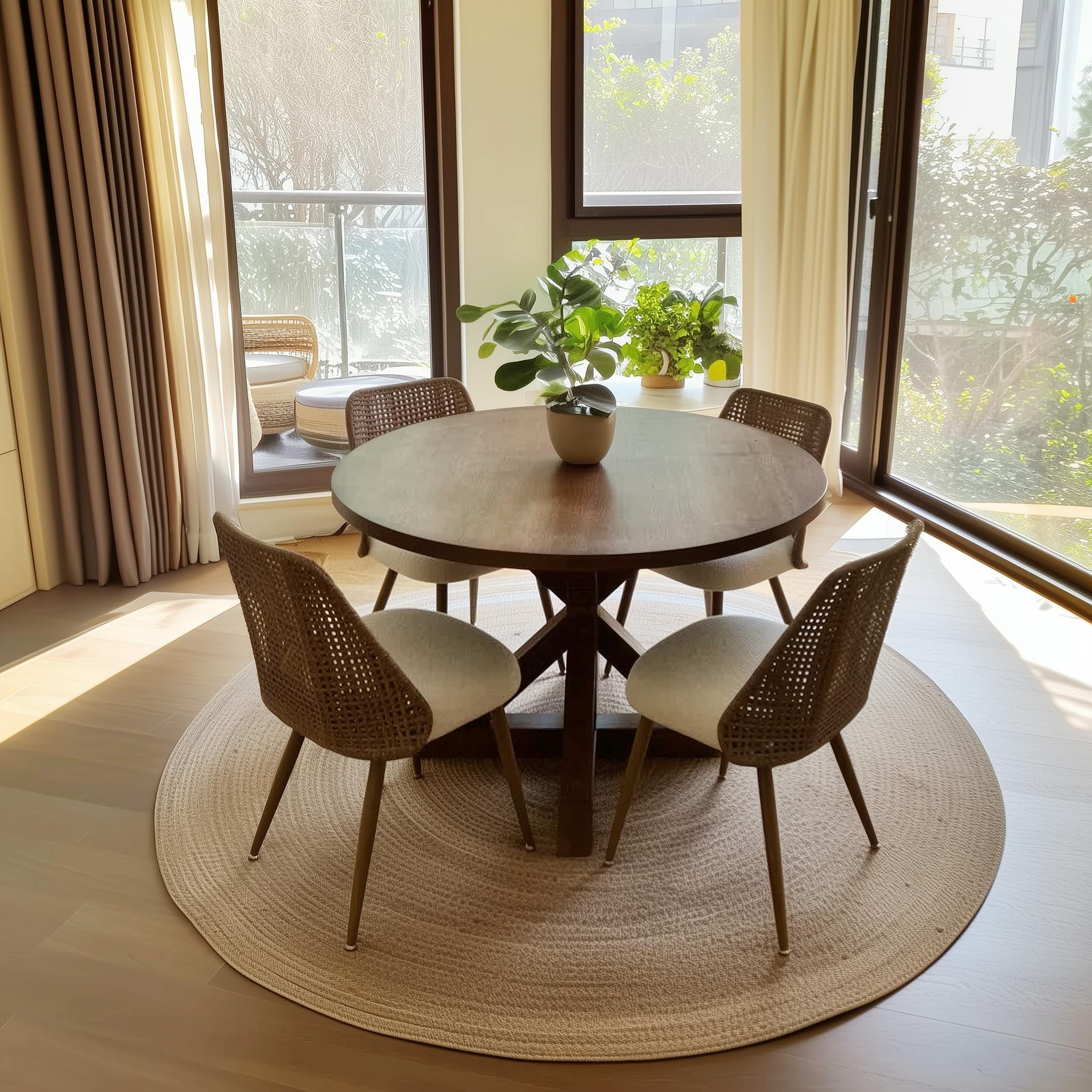The contemporary bouclé fabric adds a modern, cozy touch that fits right in with any decor.The woven rattan? It's actually high-quality plastic that looks just like the real thing but won't get damp, moldy, or develop odors. The metal legs are incredibly sturdy, with a wood grain finish so realistic they could easily pass for wooden legs.With a weight capacity of 260 lbs. per chair, they offer reliable seating for every occasion. Finished with metal glides, these chairs add a touch of elegance to any dining area.