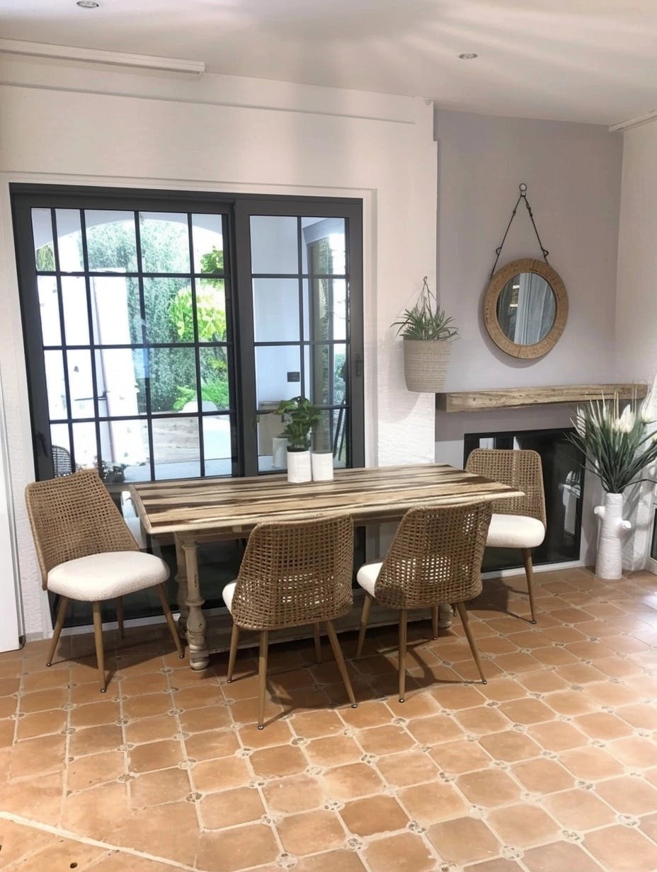 Woven-rattan design hugs a smooth, barrel-back silhouette, infusing relaxed coastal-boho vibes. A light-oak frame and ivory seat pad add organic-modern warmth—perfect for dining rooms that crave breezy beach-house charm and crisp, contemporary lines in a single piece. The full collection includes dining chairs, counter stools, and even different cushion fabrics to choose from. Check out our buyers' photos to see how beautifully it fits into every room!