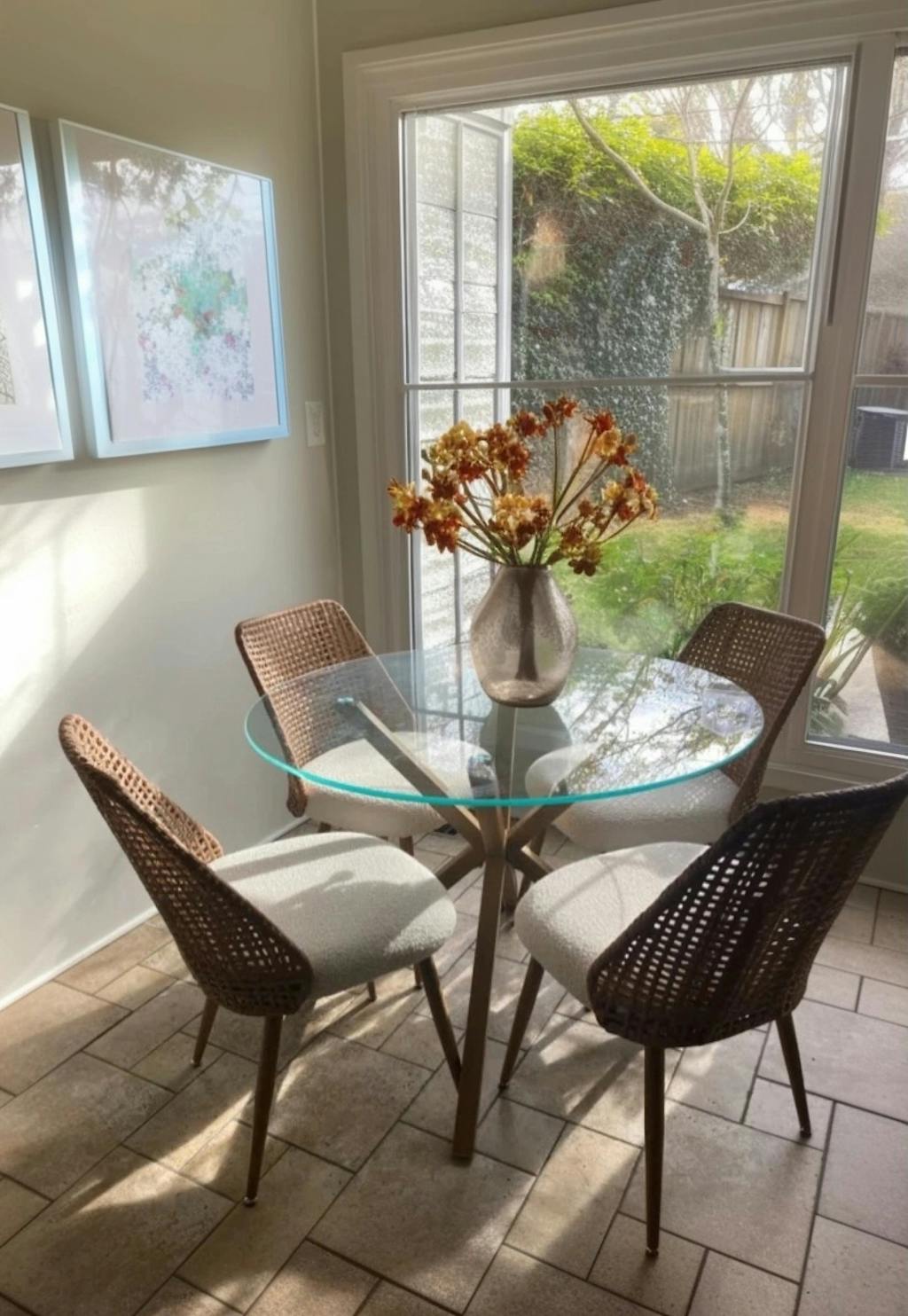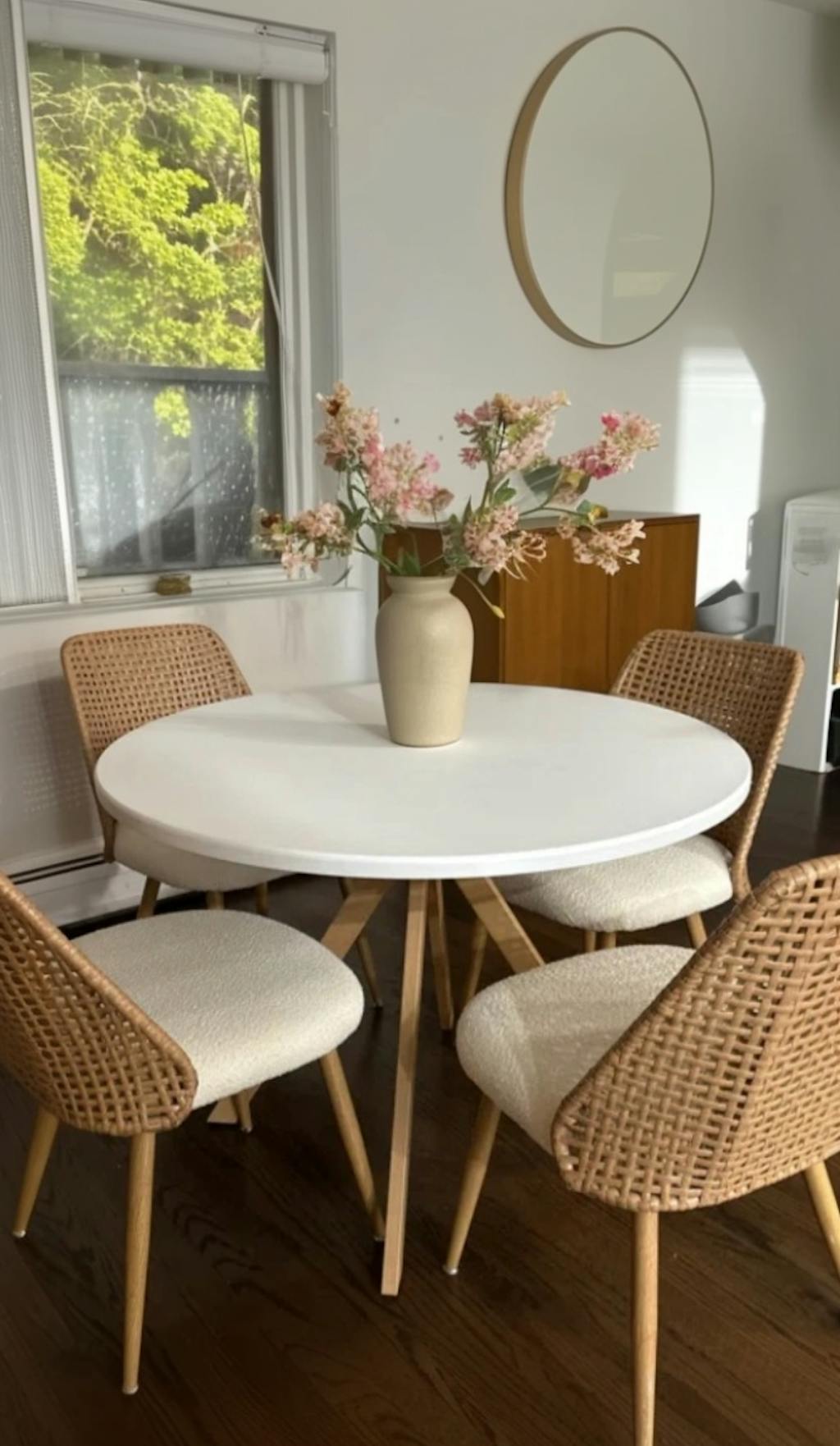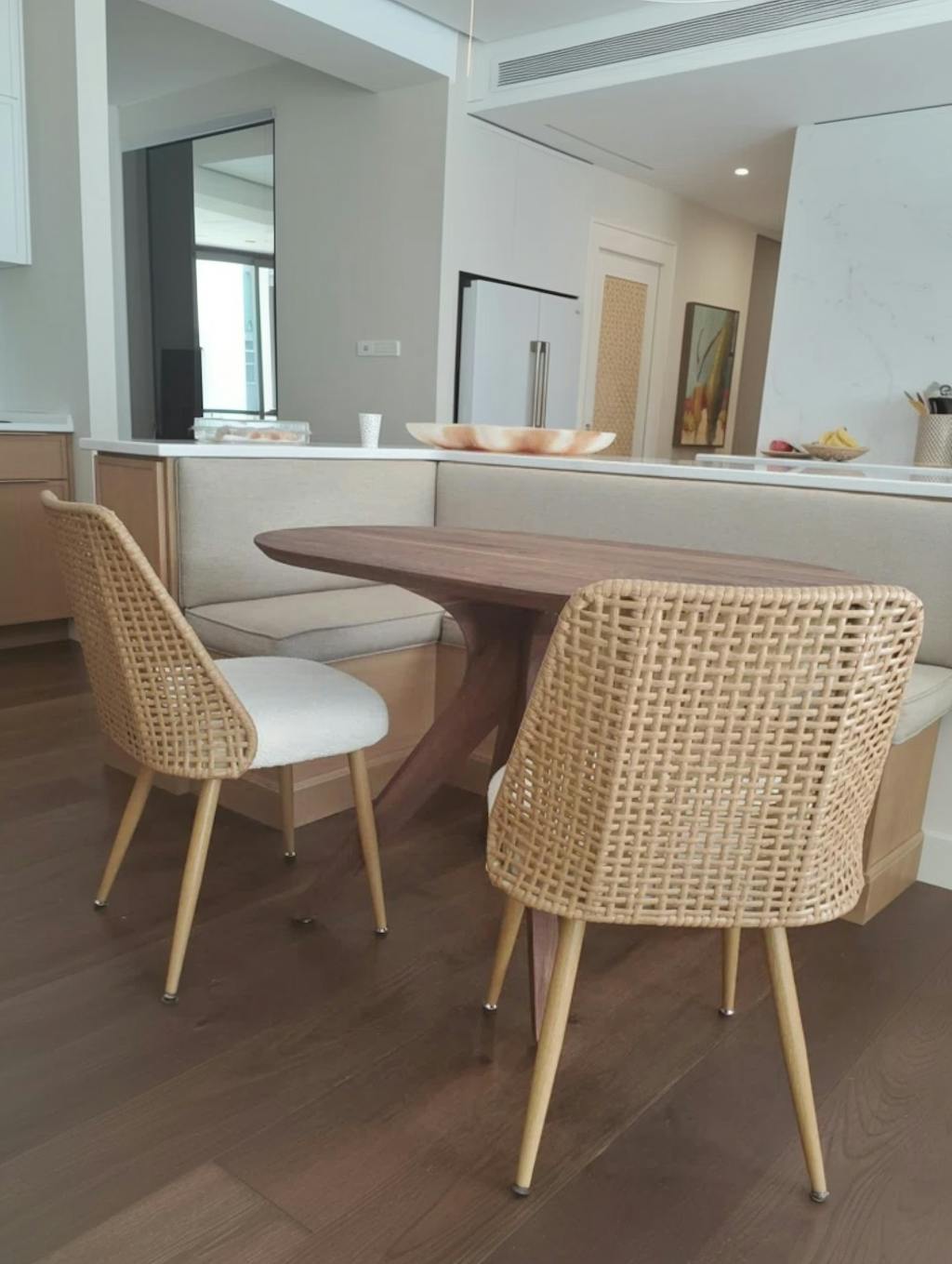 The contemporary bouclé fabric adds a modern, cozy touch that fits right in with any decor.The woven rattan? It's actually high-quality plastic that looks just like the real thing but won't get damp, moldy, or develop odors. The metal legs are incredibly sturdy, with a wood grain finish so realistic they could easily pass for wooden legs.With a weight capacity of 260 lbs. per chair, they offer reliable seating for every occasion. Finished with metal glides, these chairs add a touch of elegance to any dining area.