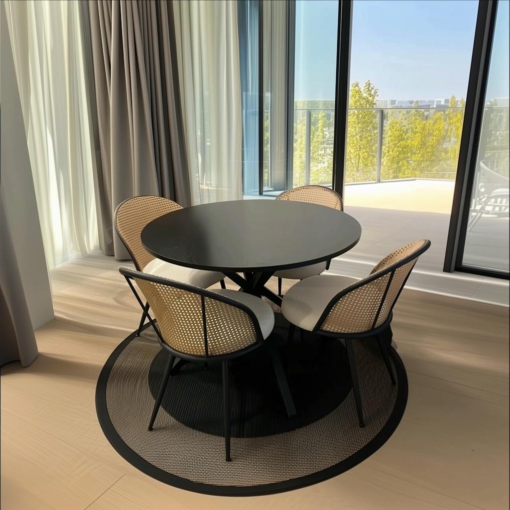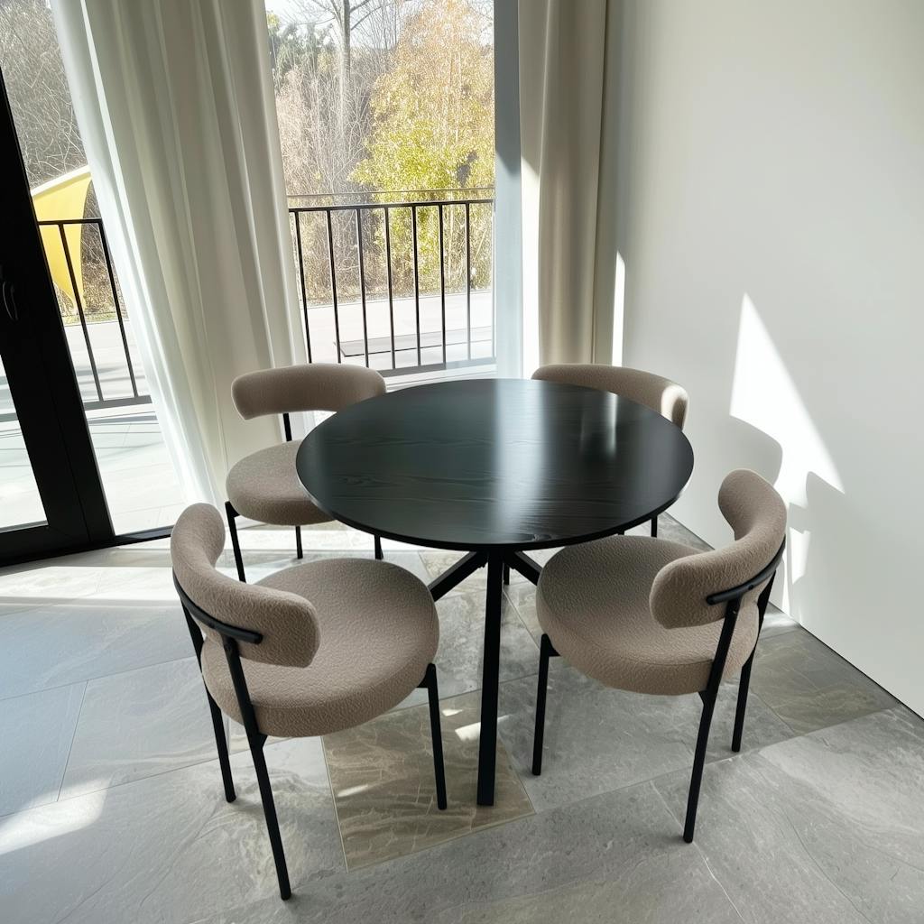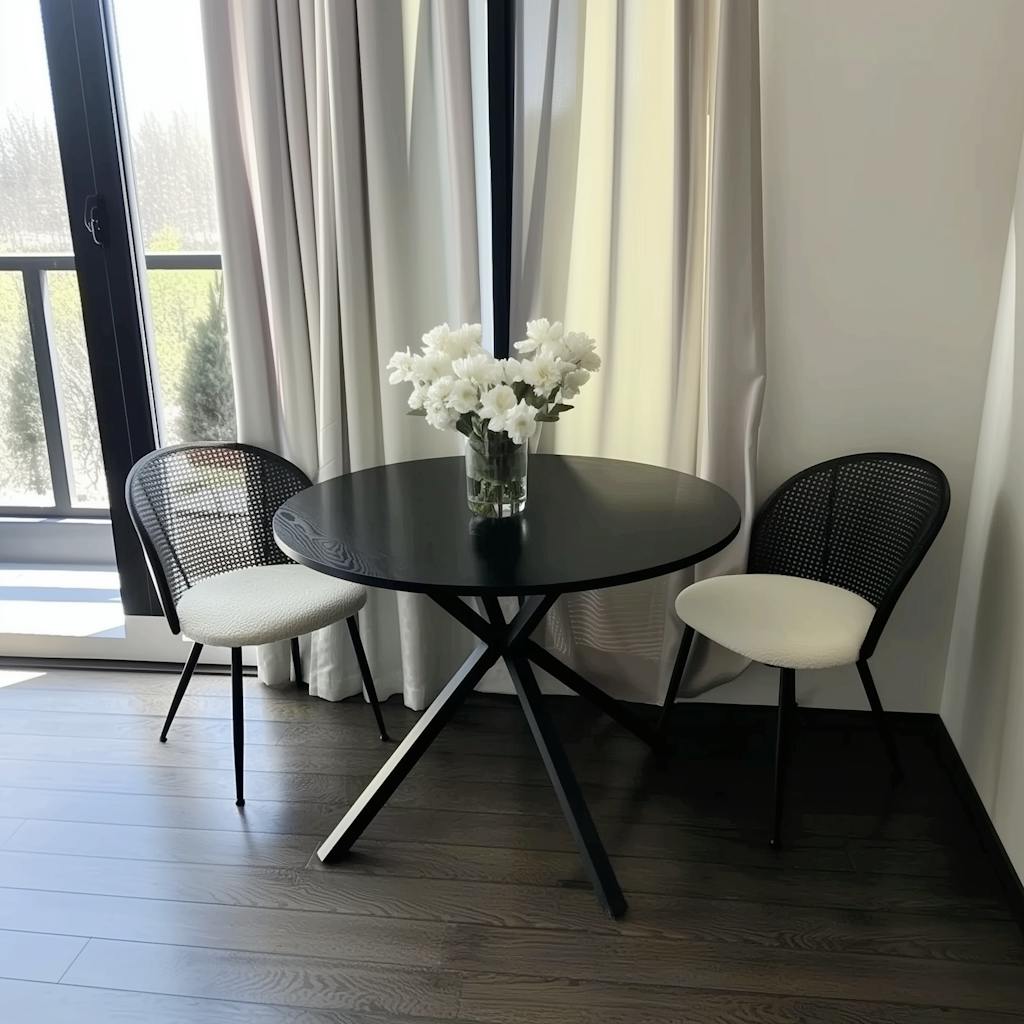 39.4'' L x 39.4'' W, decent size for an apartment, can fit four chairs easily without it seeming too cramped. The SCULPTURE matt black pedestal legs creates an OPEN and AIRY design, complete the entire look by pairing it with modern dining chairs and placing a small accent rug underneath, then it is your perfect corner of home. The HIGH-GRADE MANUFACTURED wood has black top with beautiful OAK GRAIN pattern.