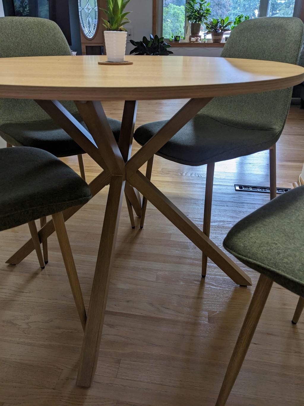 Enjoy dinner with this round dining set, perfect for casual meals and cozy coffee chats. Crafted from a durable blend of steel and engineered wood, the table boasts a striking cross base with an X-shaped silhouette, angled legs, and a sleek oak finish that adds sculptural intrigue to your dining room.