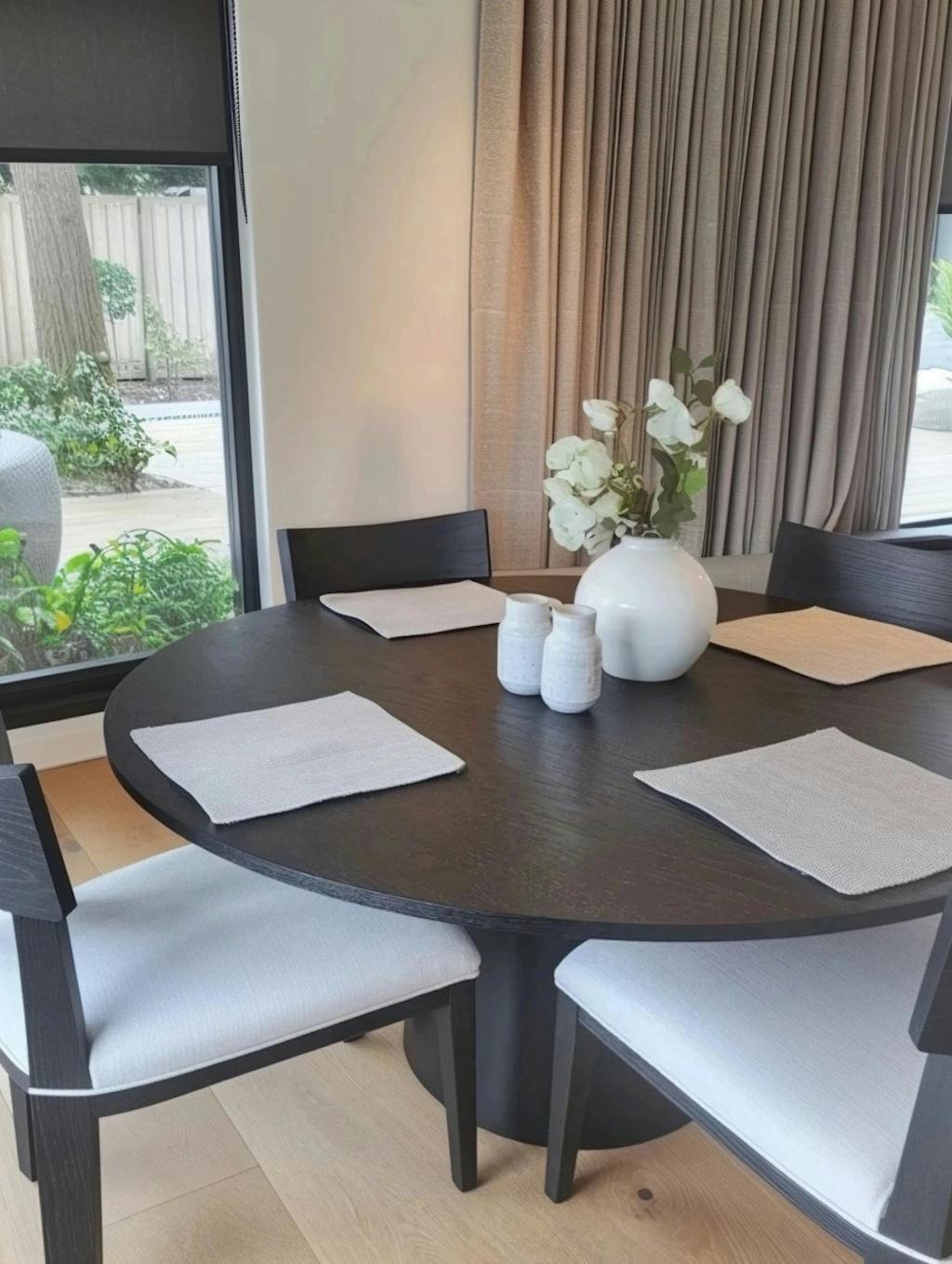 This dining table is crafted from manufactured wood with a genuine white oak veneer, showcasing stunning, natural cathedral wood grain patterns. You'll love how the wood grain stands out—it looks and feels expensive!