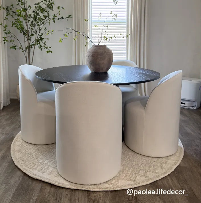 Around it sit Doris swivel bucket chairs upholstered in your choice of linen-blend neutrals or punchy chenille colors. Each chair rolls on hidden casters and pairs thick foam with a curved, wrap-around backrest, so you stay perfectly supported through lingering dinners and late-night chats. Refined piping and a sturdy frame polish off the look.