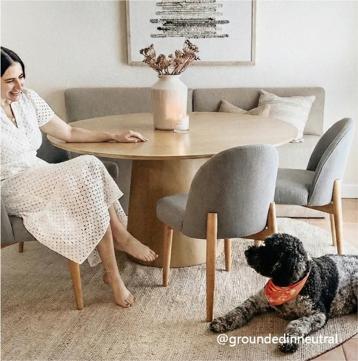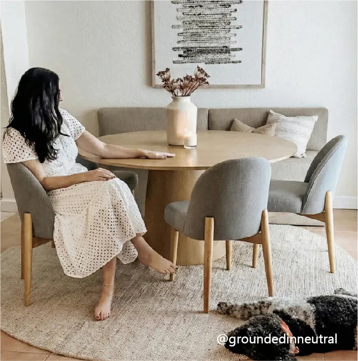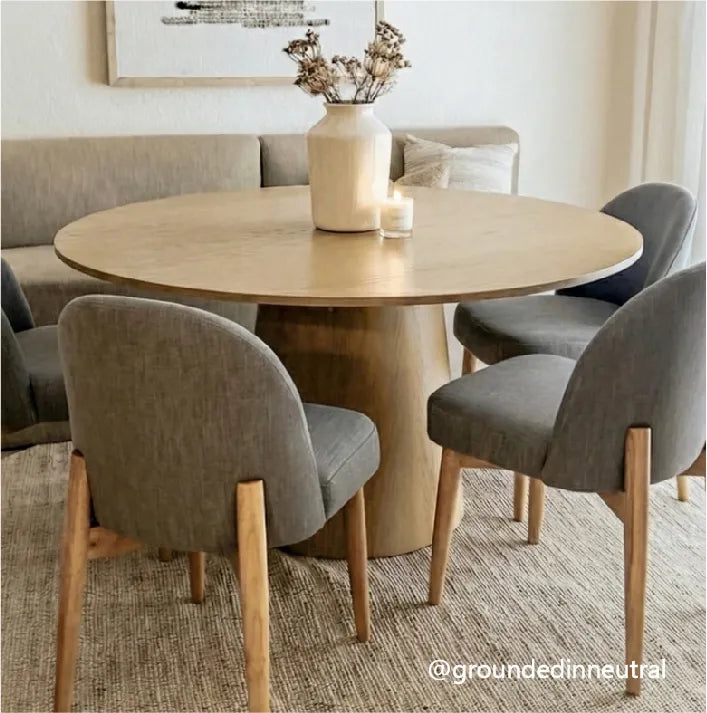 Warm oak, soft curves, and easy harmony—this complete 7-piece set brings a welcoming, design-forward look to the dining room. The 60" round pedestal table is veneered in genuine white oak, showcasing elegant cathedral grain and a gently rounded edge that keeps the flow around the table smooth.