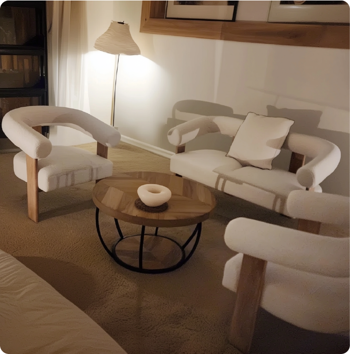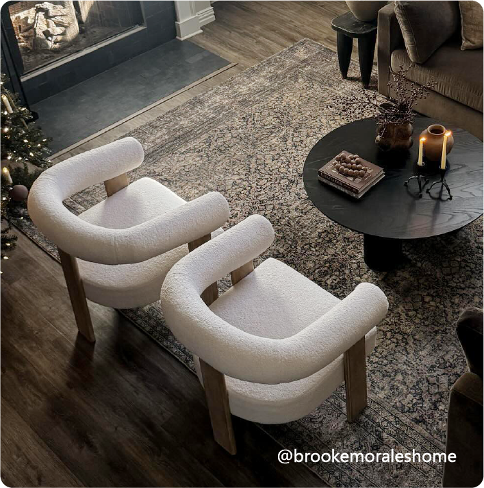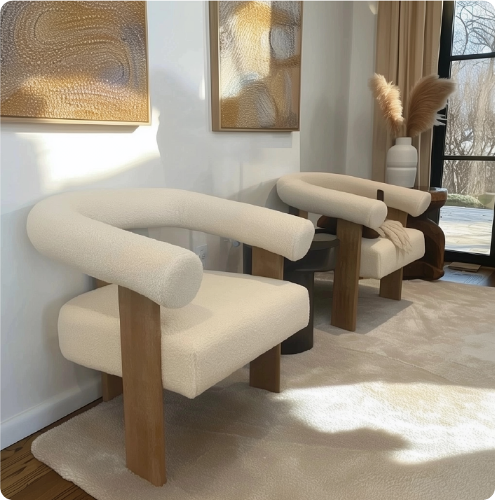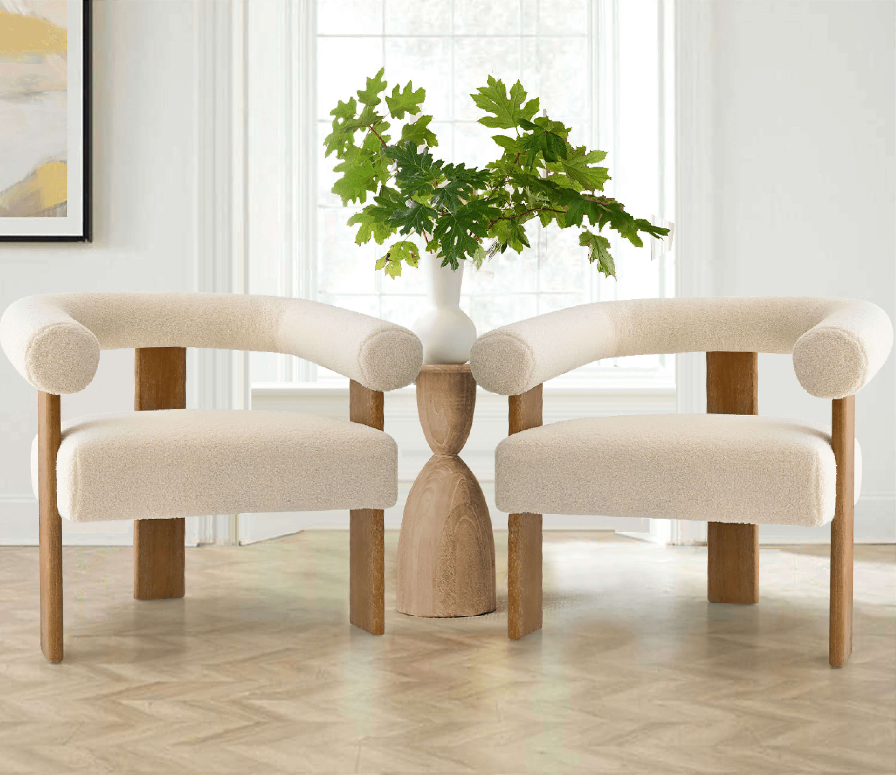 Maye Beige Boucle chairs with wooden legs, light walls, parquet flooring, and modern decor elements.