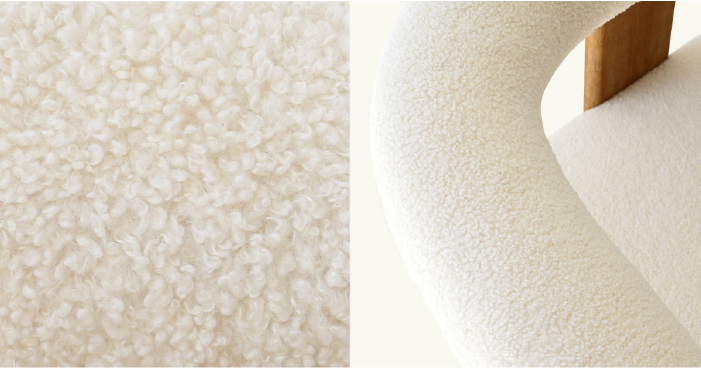 Close-up texture of beige boucle fabric on Maye living room chair upholstery.