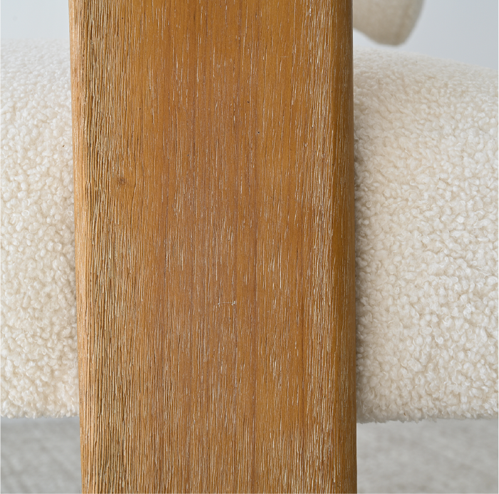 Close-up texture of Maye Beige Boucle Upholstered Living Room Chair with wooden element.