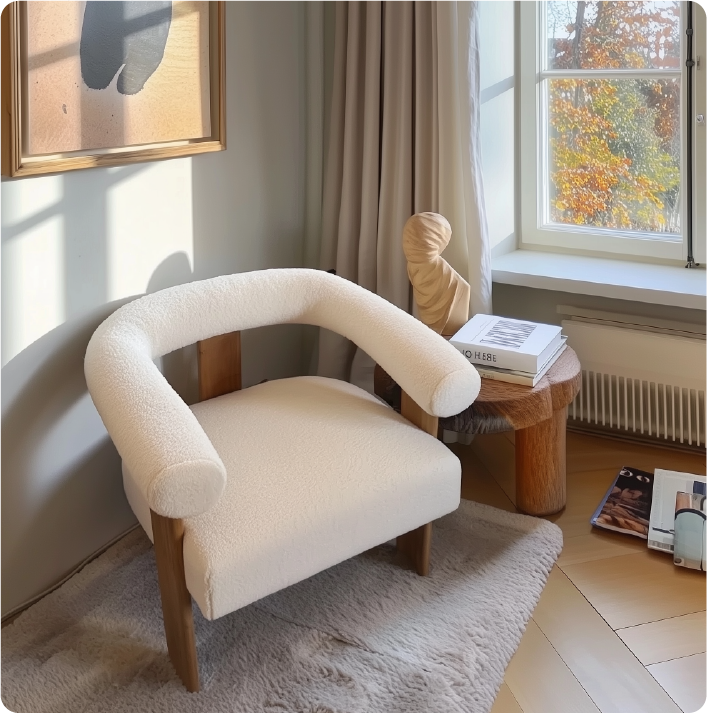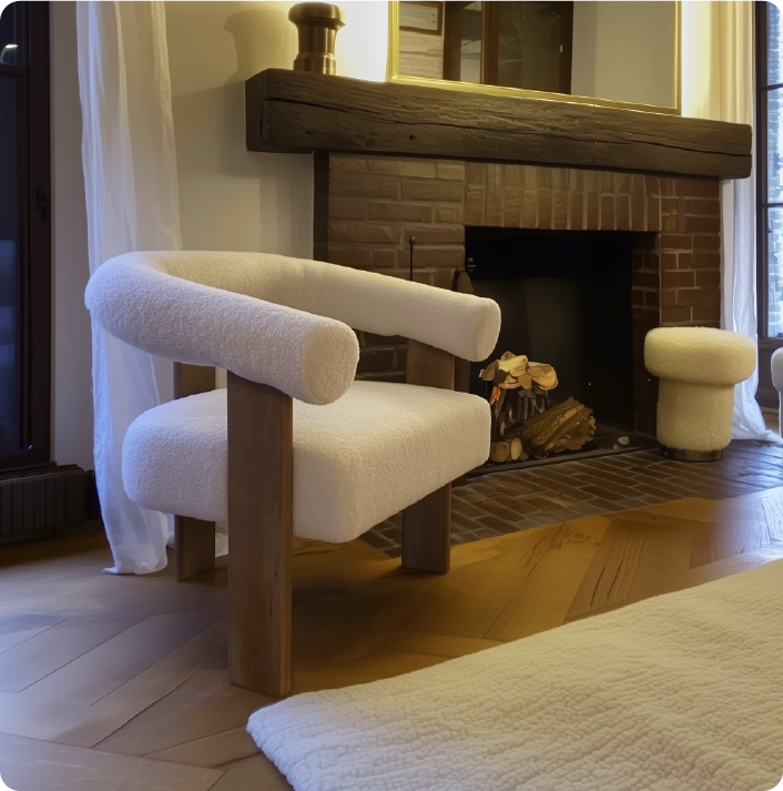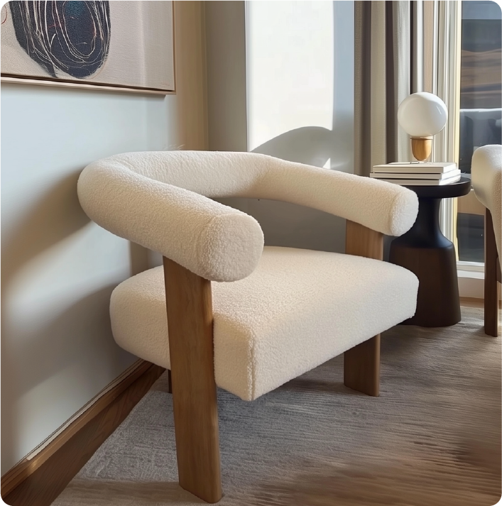 Maye Beige Boucle chair with wooden legs, elegant living room design, boucle upholstery detail.